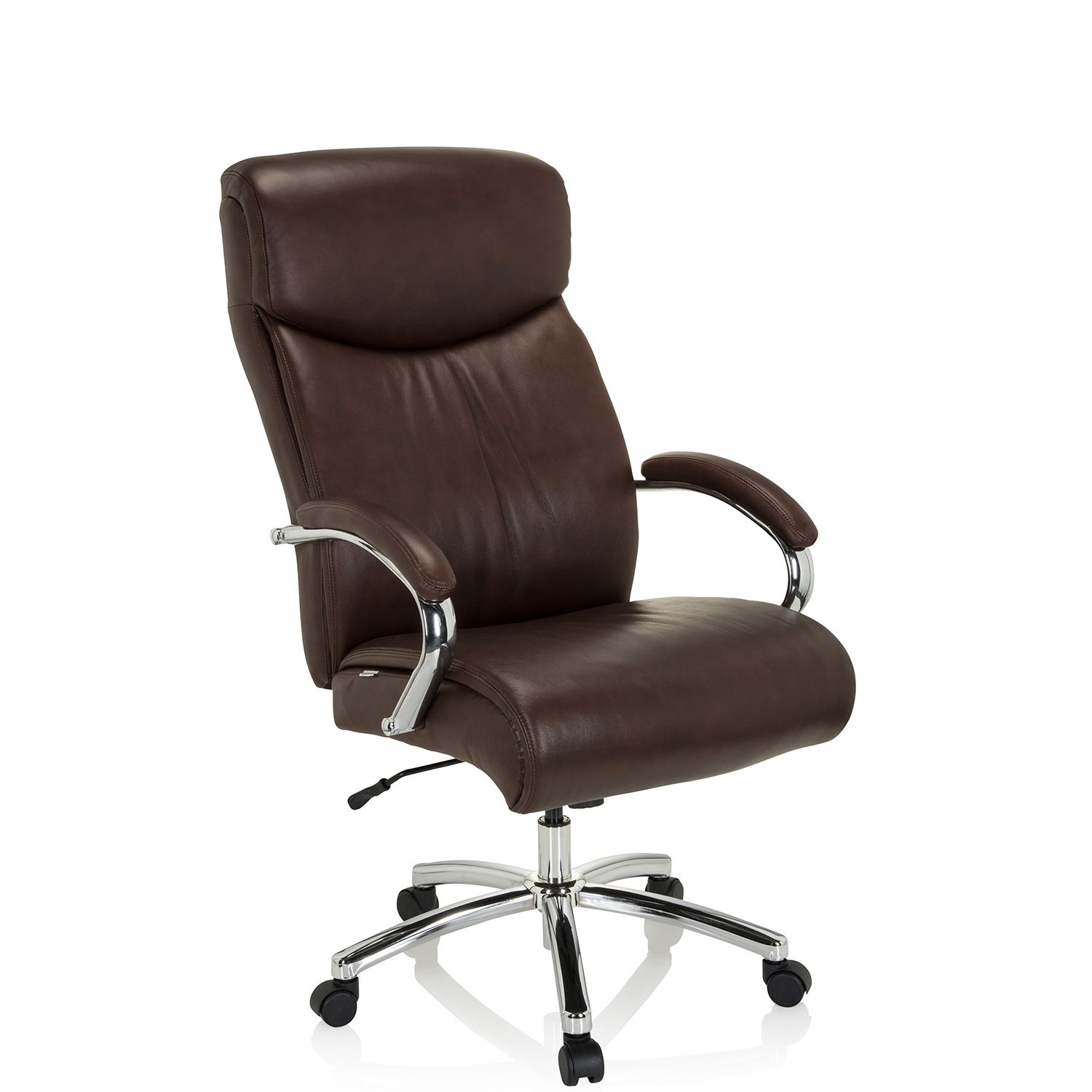 Der Schwerlast-Chefsessel SITWELL STEIFENSAND TURBO XXL mit hoher Rückenlehne ist der Wohlfühlsessel, der an jedem Arbeitsplatz gut aussieht. In diesem Schwerlastsessel sitzen Sie gesund und fühlen sich auch nach einem langen Arbeitstag immer noch fit und vital. TURBO ist mit einer sehr aufwändigen und ergonomischen Polsterung versehen. Zudem gehören höhenverstellbare Armlehnen (mit lederumpolsterten Armauflagen) zur Standardausführung. Dieser robuste Heavy-Duty XXL Chefsessel mit bequemer und ergonomischer Polsterung sowie einer weichen höhenverstellbaren Armlehne macht das Sitzen am Arbeitsplatz zum wahren Sitzerlebnis. Der Chefsessel TURBO verfügt in der Ausführung XXL über eine starre Sitzträger-Technik, die durch extra massive und verstärkte Bauelemente ein sicheres Sitzen bis 200 kg gewährleistet. Hohe ergonomische Rückenlehne mit Lordosenstütze und integrierter Kissen-Stütz-Polsterung Rückenschonendes Sitzen durch stabilitätsgewährende Formgebung Starre Sitz-Träger-Technik mit extra massiven Bauelementen Ergonomisch gepolsterter Komfortsitz zur Entlastung der Bandscheiben Extra breite 55cm Sitzfläche Belastbarkeit des Bürostuhls bis 200 kg (Schwerlaststuhl) Höhenverstellbare Armlehne ohne Aufpreis Fein gearbeitete Stilnähte Polsterung nach Wahl in hochqualitativem Stoff mit über 80.000 Scheuertouren oder echtem italienischen Rodeo-Rindsleder (Semi Anilin) Sicherheitsdoppelrollen für Teppichboden GS geprüft, Made in Germany, 3 Jahre Herstellergarantie Die Lieferung erfolgt in bereits fertig montiertem Zustand!