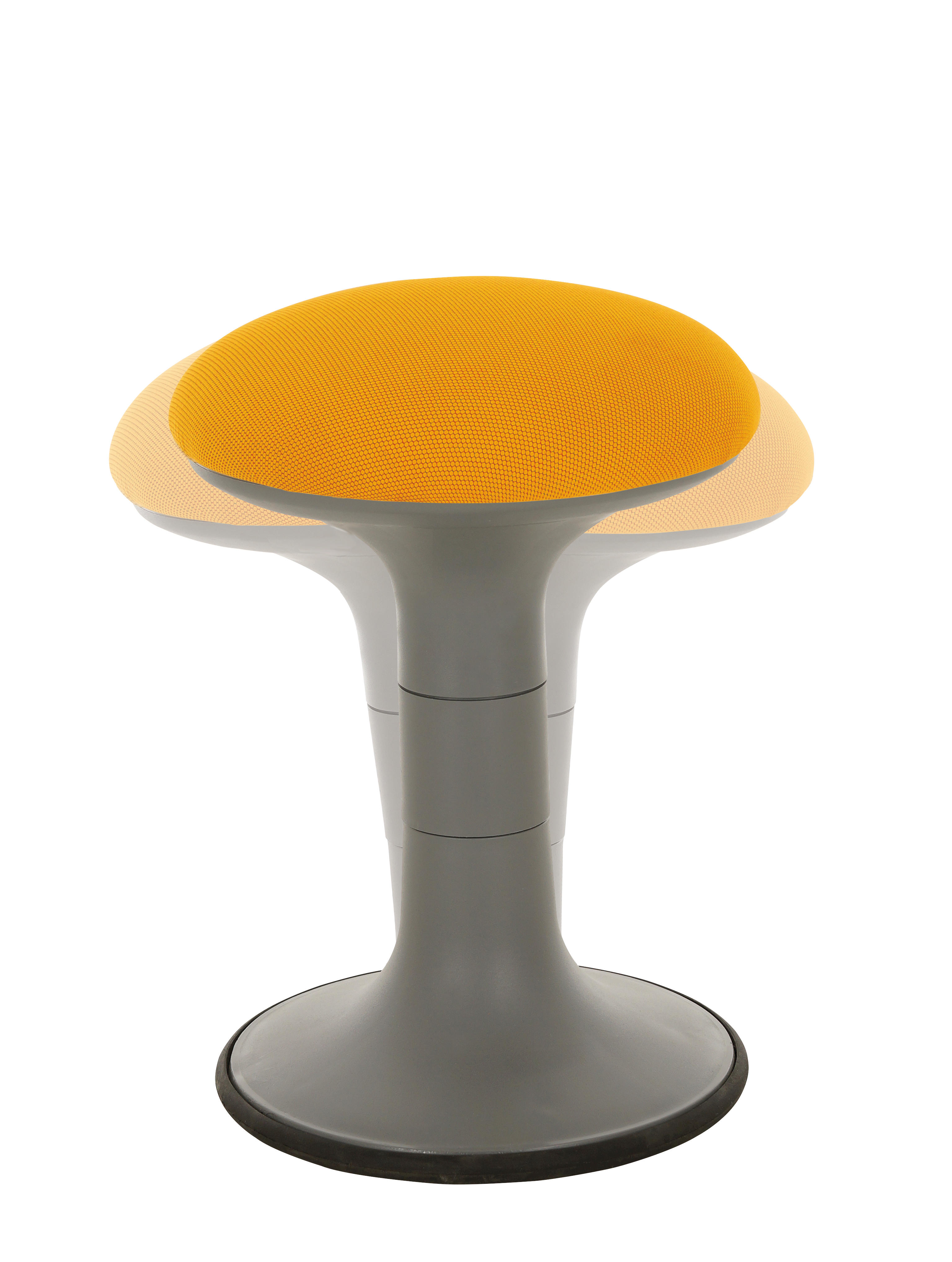 Ergonomisch geformter pilzförmiger Polstersitz mit schwingendem Standfuß in verschiedenen Sitzhöhen (47 cm, 55 cm und 62 cm).