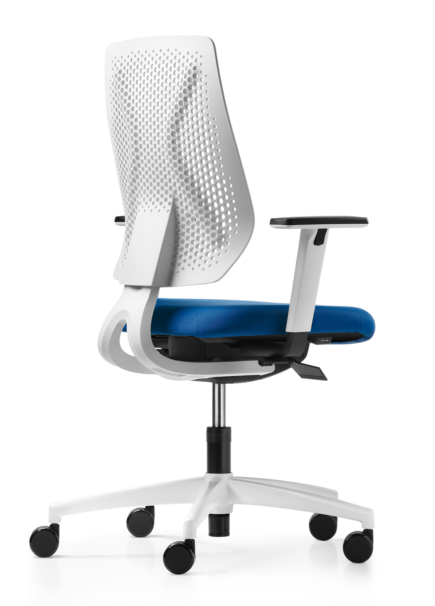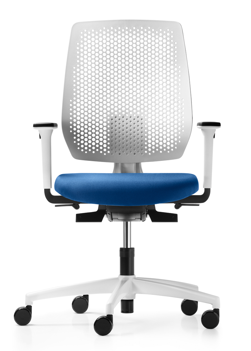 Drehstuhl mit atmungsaktiver, höhenverstellbarer Membran-Rückenlehne (58-66 cm.) und Syncro-Relax-Automatic-Mechanik: der Rückenlehnendruck passt sich automatisch in jeder Sitzposition dem Körpergewicht an. Integrierte Sitzneigung serienmäßig.