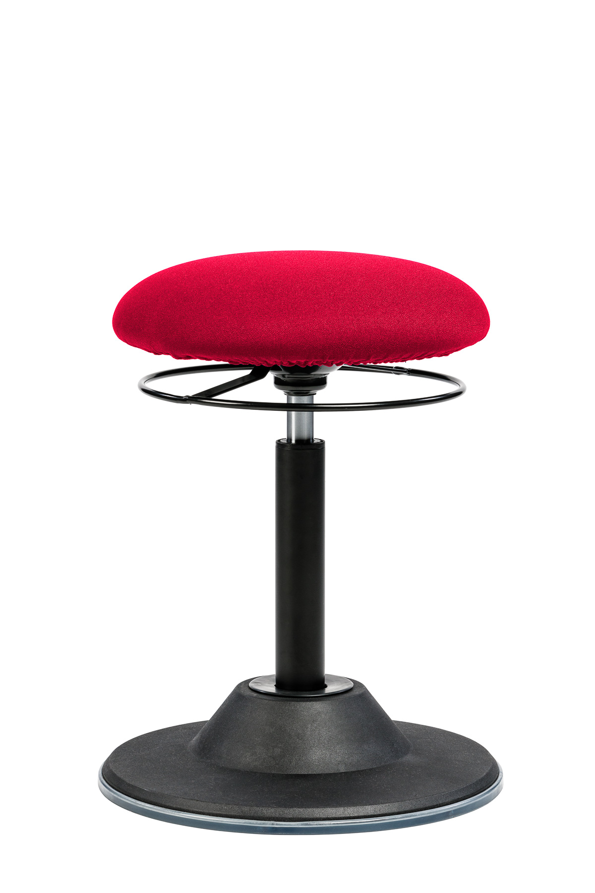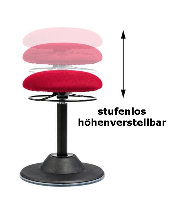 Ergonomisch geformter pilzförmiger Polstersitz mit schwingendem Standfuß in verschiedenen Sitzhöhen (47 cm, 55 cm und 62 cm). Rutschfester Gummifuß, platzsparend und leicht verstaubar.