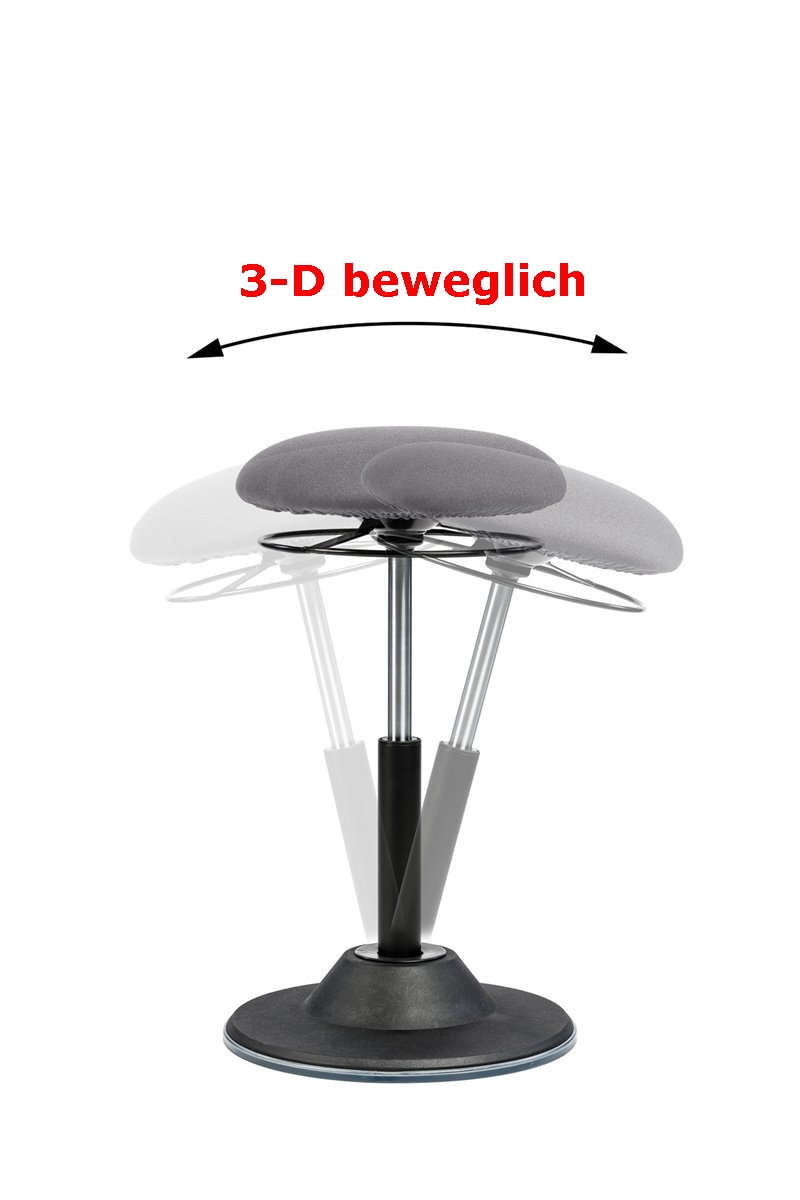 Multibeweglicher Sitzhocker mit um 360 Grad drehbarer Sitzfläche zur Entlastung Ihres Körpers. Dynamisches Sitzen durch dreidimensional bewegliche Sitzfläche. Der Sitzhocker schwingt in alle Richtungen mit und passt sich Ihrer Körperhaltung optimal an. Bandscheiben und Kniegelenke werden entlastet. Bleiben Sie in Bewegung und erhöhen Sie dadurch Ihre Leistungsfähigkeit und Ausdauer! Die dreidimensional bewegliche Säule ist pendelnd gelagert, stufenlose Höhenverstellung des Sicherheits-Gasliftes per Ringauslösung, Sitz mit strapazierbarem Stoffbezug, runder Metallfuß pulverbeschichtet schwarz.