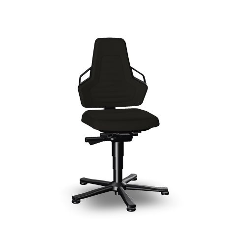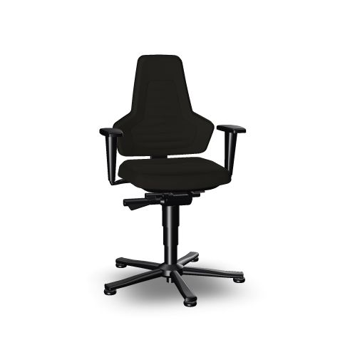 Der ESD-Drehstuhl nero von bemefa simco ist bis zu 150kg belastbar. Er verbindet Standhaftigkeit mit ergonomischer Form und eleganter Optik. Die Rückenlehne ist im oberen Bereich für mehr Bewegungsfreiheit schmaler geformt und verbreitert sich im Beckenbereich zur optimalen Stabilisierung. Dank seiner anpassbaren Synchronmechanik und der höhenverstellbaren Rückenlehne ermöglicht er eine dynamische Sitz- Rückenneigebewegung. Außerdem verfügt er über eine Sitztiefenverstellung (6 cm.) durch einen integrierten Schiebesitz. Optional mit Multifunktionsarmlehnen (höhen- und tiefenverstellbar). Synchrone Sitzmechanik, Sitzneigung und Rückenneigung bewegen sich automatisch im Verhältnis 1:3 zueinander, in 5 Stufen arretierbar Sitzmechanik mit Andruckregulierung über Kurbel, bis zu einem Körpergewicht von 150 kg belastbar Sitzflächen-Tiefenverstelllung, ca. 60 mm über integrierten Schiebesitz Rückenhöhenverstellung, 70 mm, über Rasterung Aluminiumfußkreuz 655 mm, poliert, mit breiter Fußauflagefläche Doppelrollen: 50 mm, lastabhängig gebremst nach DIN EN 12529 wahlweise festes Fußkreuz, mit Gleitern aus Kunststoff Optional 3D-Armlehnen mit PU gepolsterter Armauflage, höhen- und tiefenverstellbar (jeweils um 70 mm)
