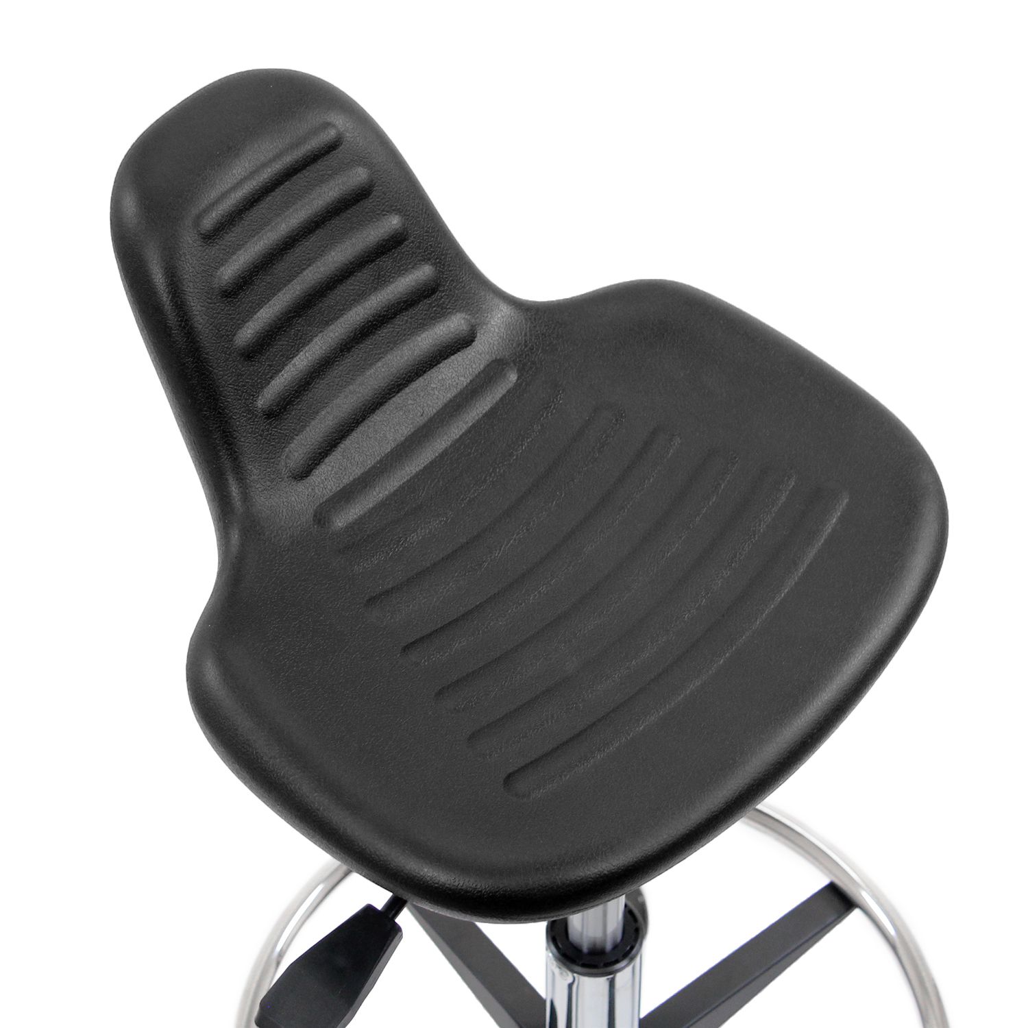 Der Arbeitsstuhl TOP WORK 03 unterstützt Sie bei der täglichen Arbeit. Der Sitz aus Hartschaum bietet mit rutschhemmenden Querrillen hohe Sicherheit. Unterstützt wird dies durch das breite Fußkreuz welches einen sicheren Stand garantiert. Die ebenso wie das Fußkreuz verchromte umlaufende Fußstütze fördert das ermüdungsfreie Sitzen am Arbeitsplatz. Dabei ist der Arbeitsstuhl auch für große Menschen bzw. hohe Arbeitsflächen geeignet und lässt sich bis auf 87 cm Sitzhöhe ausfahren. Der Stuhl kann wahlweise mit Stuhlrollen oder mit Standfüßen verwendet werden.