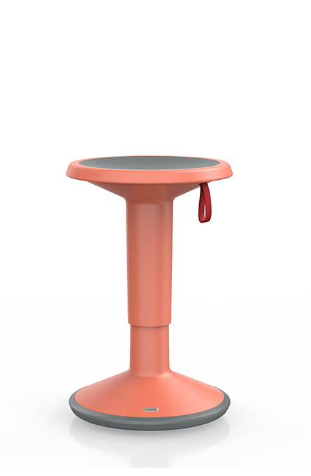 Ergonomisch geformter pilzförmiger Polstersitz mit schwingendem Standfuß in verschiedenen Sitzhöhen (47 cm, 55 cm und 62 cm). Rutschfester Gummifuß, platzsparend und leicht verstaubar.