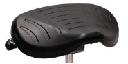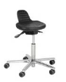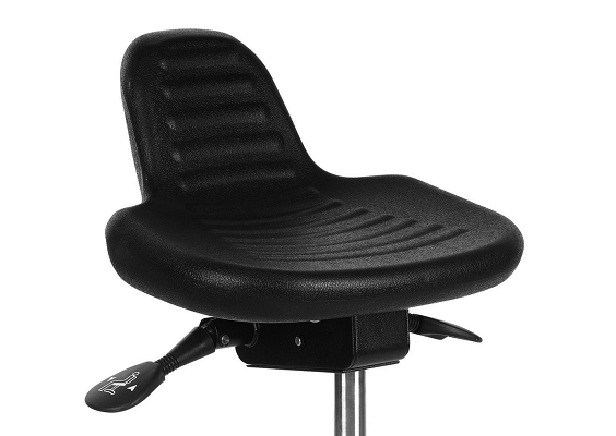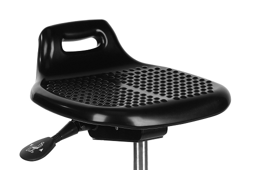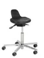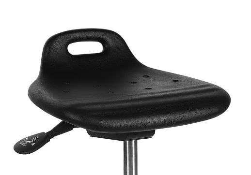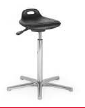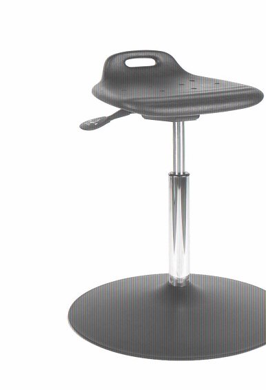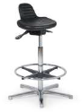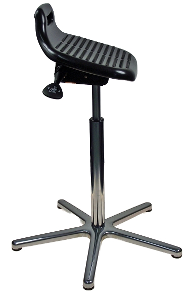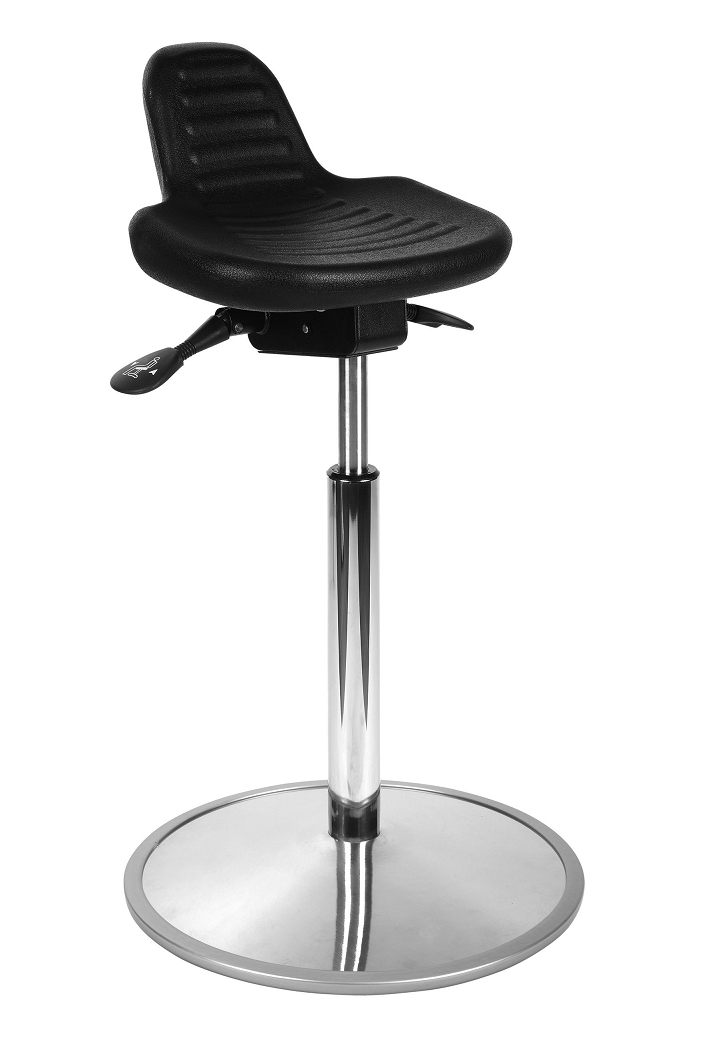 Stehhilfe für hohe Beanspruchung in Industrie und Büro. breiter PU-Komfort-Sitz (42 cm), schwarz Sitzneige um 12° verstellbar Höhenverstellung mittels drehgesicherter, verchromter Gasfeder Griff an der Sitzrückseite ermöglicht leichteren Transport oder z. B. das Aufhängen von Kleidung Fußgestell aus Aluminium, poliert, mit integrierten Transportrollen Belastbarkeit bis 150 kg Optional: klappbare Fußstütze
