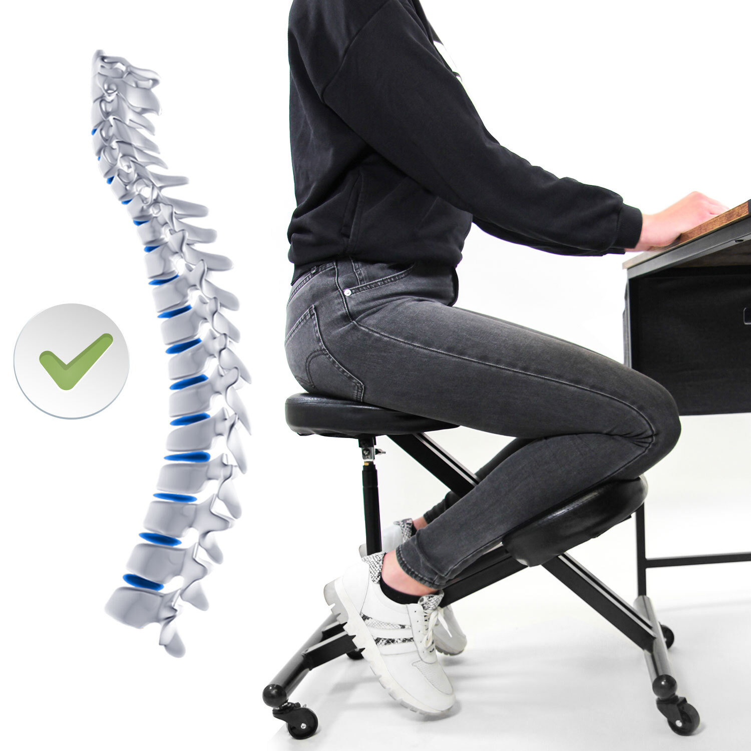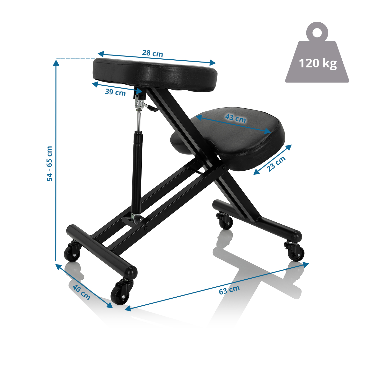 Rückenfreundlicher Kniestuhl / Kniehocker, der eine aufrechte und aktive Sitzhaltung fördert und Bauch- sowie Rückenmuskulatur aktiviert. Das Becken wird in eine aufrechte Position gebracht, Rücken und Wirbelsäule werden entlastet. Eine Gasfeder ermöglicht eine stufenlose Sitzhöhenverstellung und das Stahlgestell inklusive Teppichbodenrollen mit Feststellbremsen sorgt für einen sicheren festen Stand. Die dichte Schaumstoff-Polsterung ist mit pflegeleichtem Kunstleder überzogen.