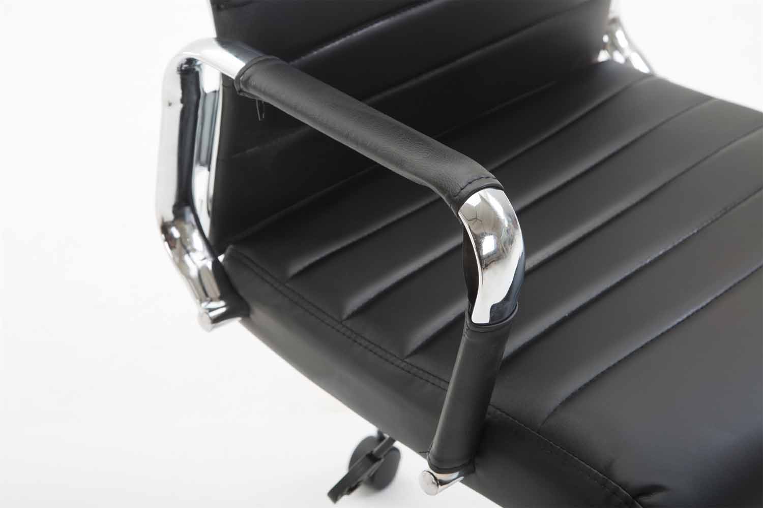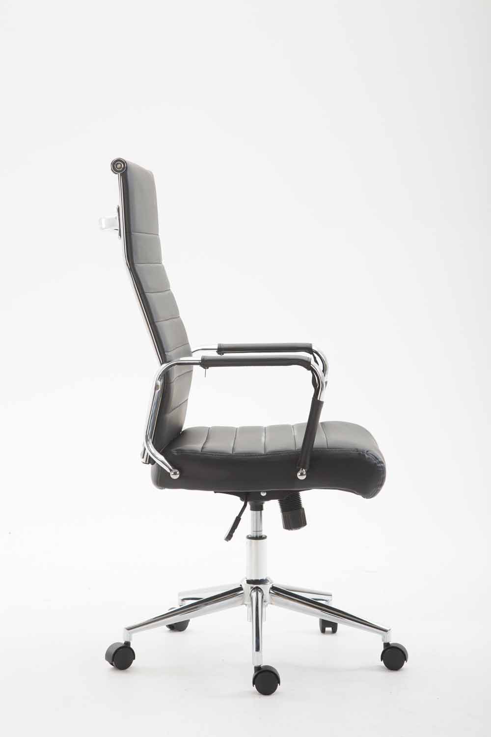 Seine hochwertige Polsterung und der pflegeleichte Kunstlederbezug (wahlweise auch in Stoff) gewährleisten ein angenehmes Sitzgefühl, auch noch nach mehreren Stunden Sitzdauer. Stufenlos verstellbare Sitzhöhe und Wippmechanismus sorgen für Bewegungsfreiheit und Ergonomie. Neben den stabilen Armlehnen mit elegantem Schwung sorgt das Metallgestell in Chromoptik für das gewisse Extra. Die Leichtlaufrollen sind sowohl für harte als auch weiche Böden geeignet.