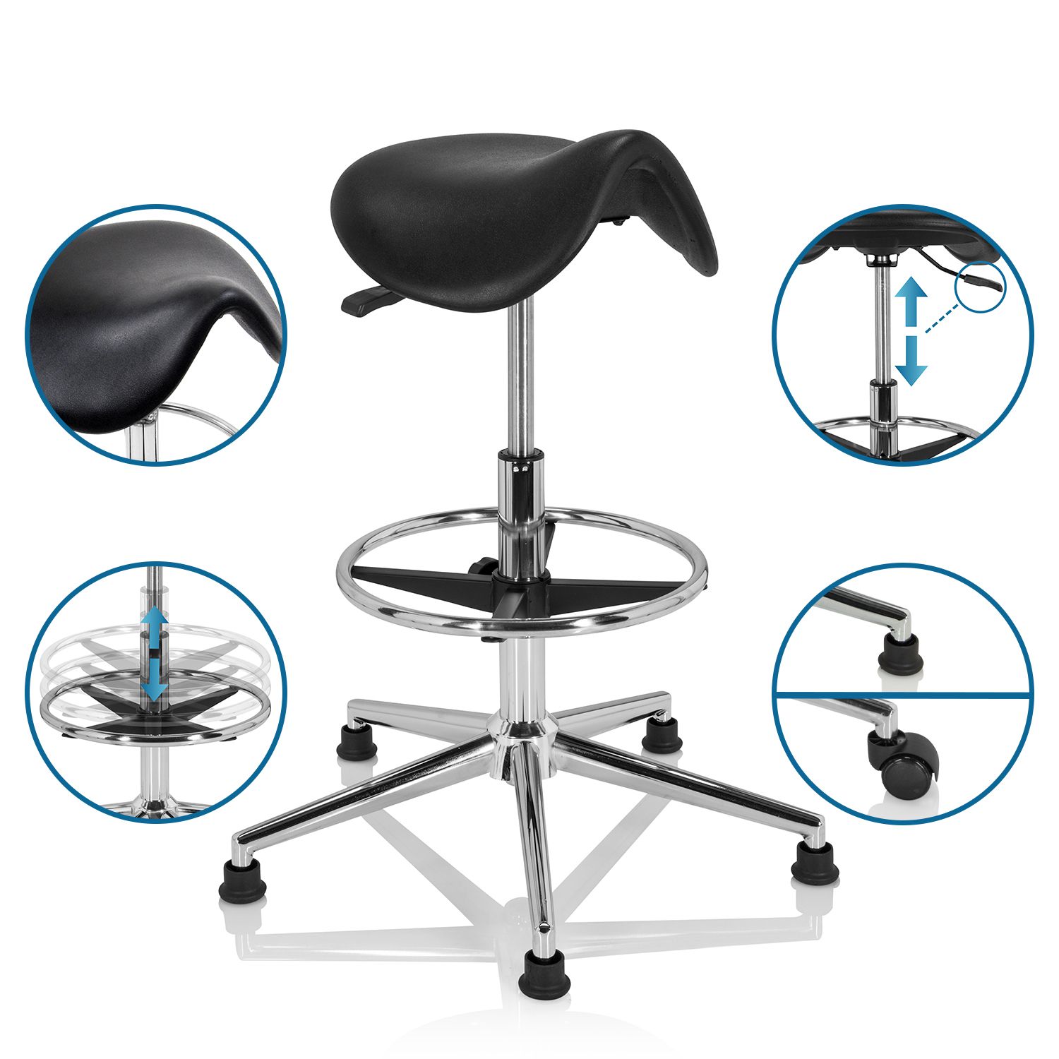 Ultrahoch verstellbarer sattelhocker mit ergonomisch geschwungener Sitzfläche aus extrem haltbaren PU-Schaum und komfortablen, höhenverstellbarem Fußring Die Sitzhöhe ist stufenlos verstellbar. Er besitzt ein hochwertig verchromtes Stahl-Fußkreuz und wird mit lastabhängig gebremsten Rollen UND Gleitern geliefert.