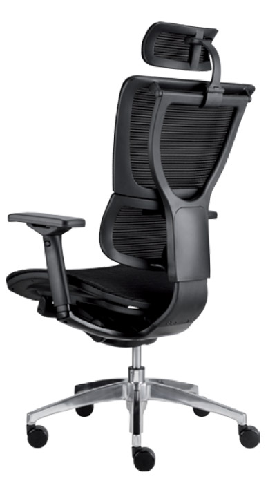 Moderner, sehr bequemer Sessel der höheren Klasse mit atmungsaktiver, höhenverstellbarer Rückenlehne und flexibler Lordosenstütze. Die Rückenlehne ist mit einem schwarzen, atmungsaktiven Netz bespannt und mit einer verstellbaren 3D-Kopfstütze ausgestattet. Der Sitz ist in dieser Variante aus einem schwarzen, atmungsaktiven, selbsttragenden Netz gefertigt.
