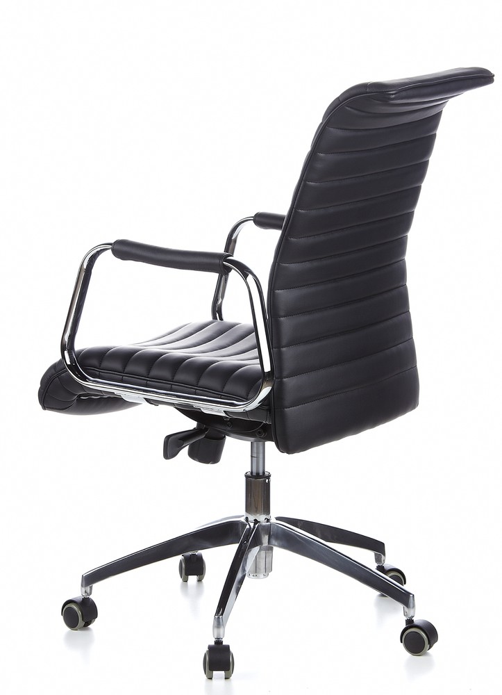 VILLA - Designerstuhl mit maximalem Komfort! VILLA - ein repräsentativer Premium-Lederbürostuhl in exklusivem und zeitlosem Design. Allen voran die Synchronmechanik: Sie kombiniert die Rückwärtsbewegung der Rückenlehne mit der Neigung der Sitzfläche. Die dicke Polsterung sorgt für einen angenehmen Sitzkomfort. Die Polsterung ist doppellagig, und somit äußerst üppig und wirkt durch das gesteppte Muster und dem Design-Element Reißverschluß sehr edel. Die qualitativ hochwertige Verarbeitung lässt hier keine Wünsche offen. Der moderne Designer-Stuhl VILLA 10 überzeugt durch Optik, Qualität und erstklassigem Sitzgefühl. Formschönes Design aus feinstem Nappaleder Mit üppiger, doppellagiger Polsterung in aufwändig gestepptem Muster Alle Teile sind sehr hochwertig und stabil gefertigt Stufenlose Sitzhöhenverstellung mit Toplift Synchronmechanik, 4-fach arretierbar, mit großem Öffnungswinkel von Sitz- und Rückenlehne Formschöne Armlehnen (alu poliert) mit abnehmbarer Lederauflage Extra großes Designer-Fußkreuz Aluminium, poliert Der Reißverschluss dient nur zur Dekoration - der Bezug lässt sich nicht abnehmen Ausgestattet mit lastabhängig gebremsten Multifunktionsrollen, für alle Böden geeignet. Dadurch rollt der Stuhl nur unter Belastung, in unbelastetem Zustand bremsen die Rollen, um ein ungewolltes Wegrollen zu verhindern.