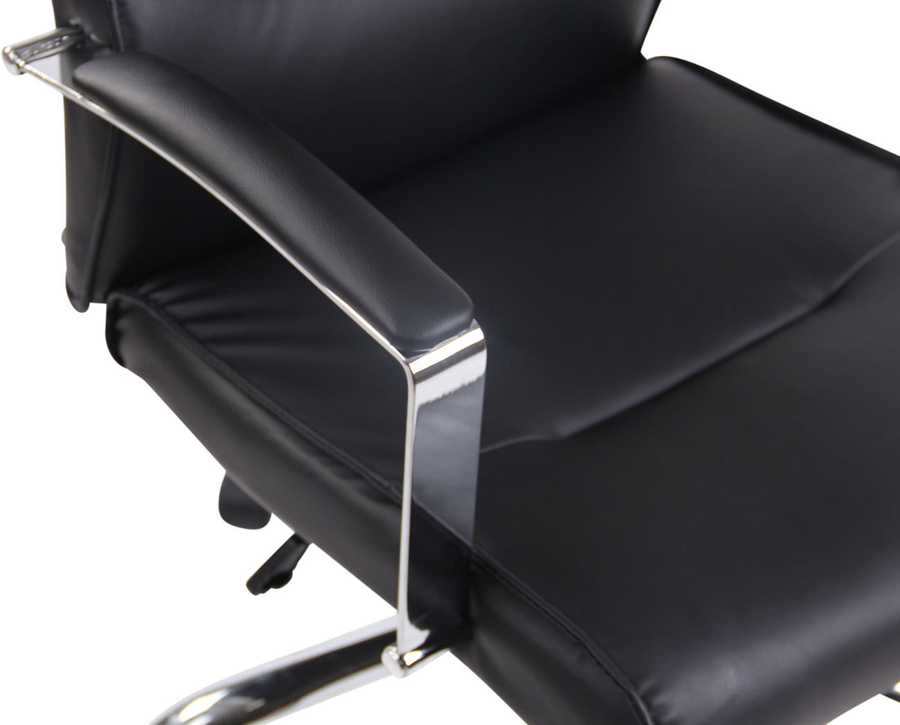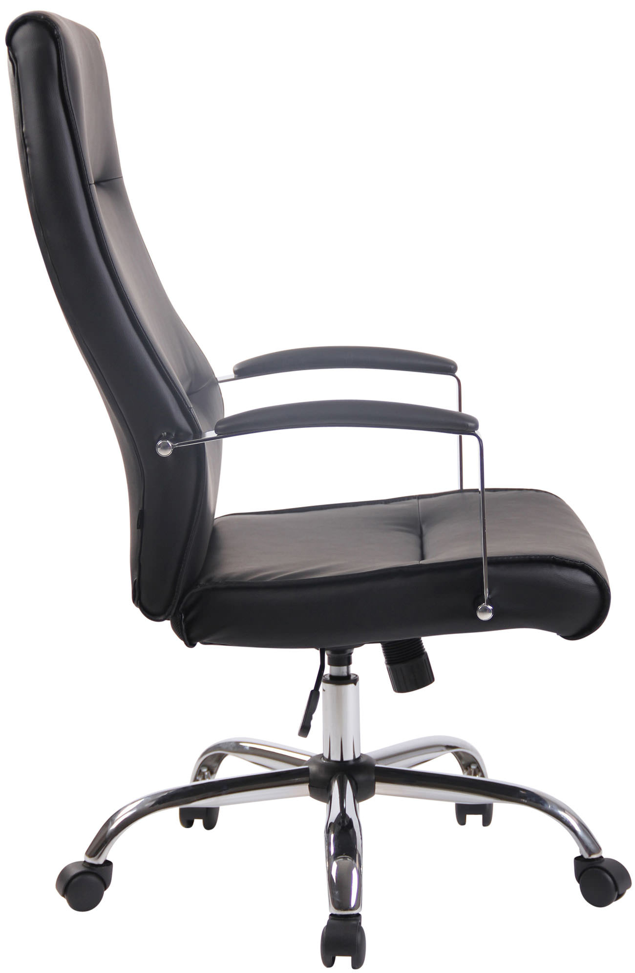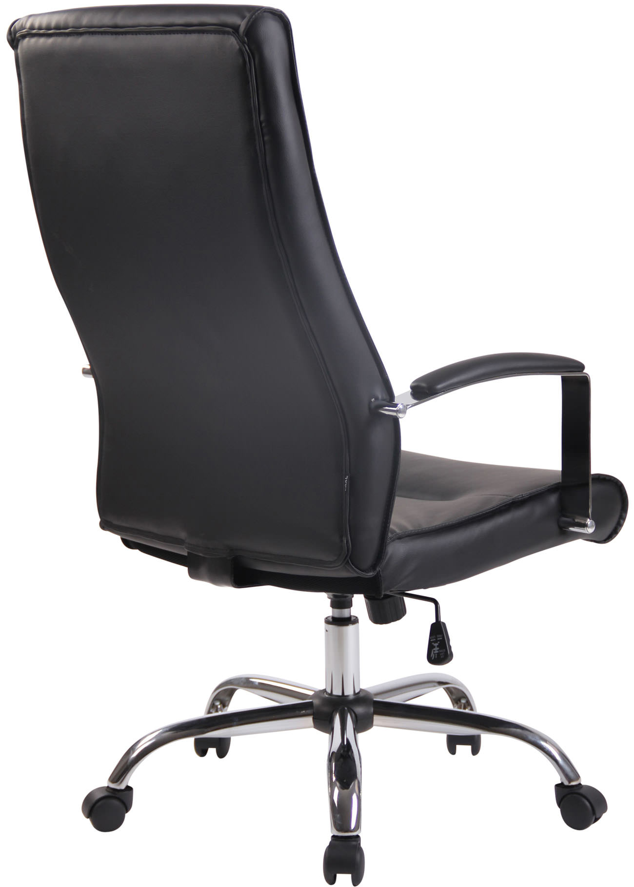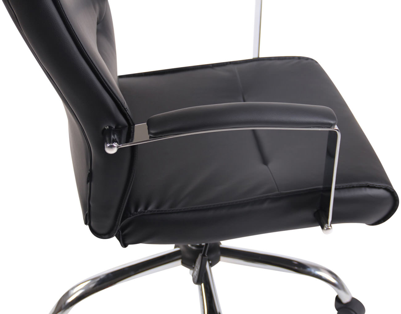 Komfort-Bürostuhl in klassischem Look! Seine hochwertige Polsterung und der pflegeleichte Kunstlederbezug (wahlweise auch in Stoff) gewährleisten ein angenehmes Sitzgefühl, auch noch nach mehreren Stunden Sitzdauer. Stufenlos verstellbare Sitzhöhe und Wippmechanismus sorgen für Bewegungsfreiheit und Ergonomie. Neben den stabilen Armlehnen mit elegantem Schwung sorgt das Metallgestell in Chromoptik für das gewisse Extra. Die Leichtlaufrollen sind sowohl für harte als auch weiche Böden geeignet.