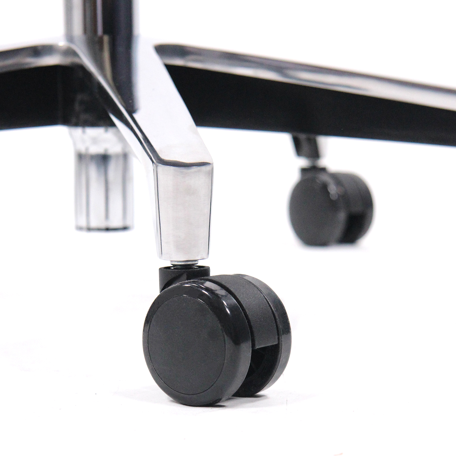 - Ausgestattet mit lastabhängig gebremsten Multifunktionsrollen, für alle Böden geeignet. Dadurch rollt der Stuhl nur unter Belastung, in unbelastetem Zustand bremsen die Rollen, um ein ungewolltes Wegrollen zu verhindern.