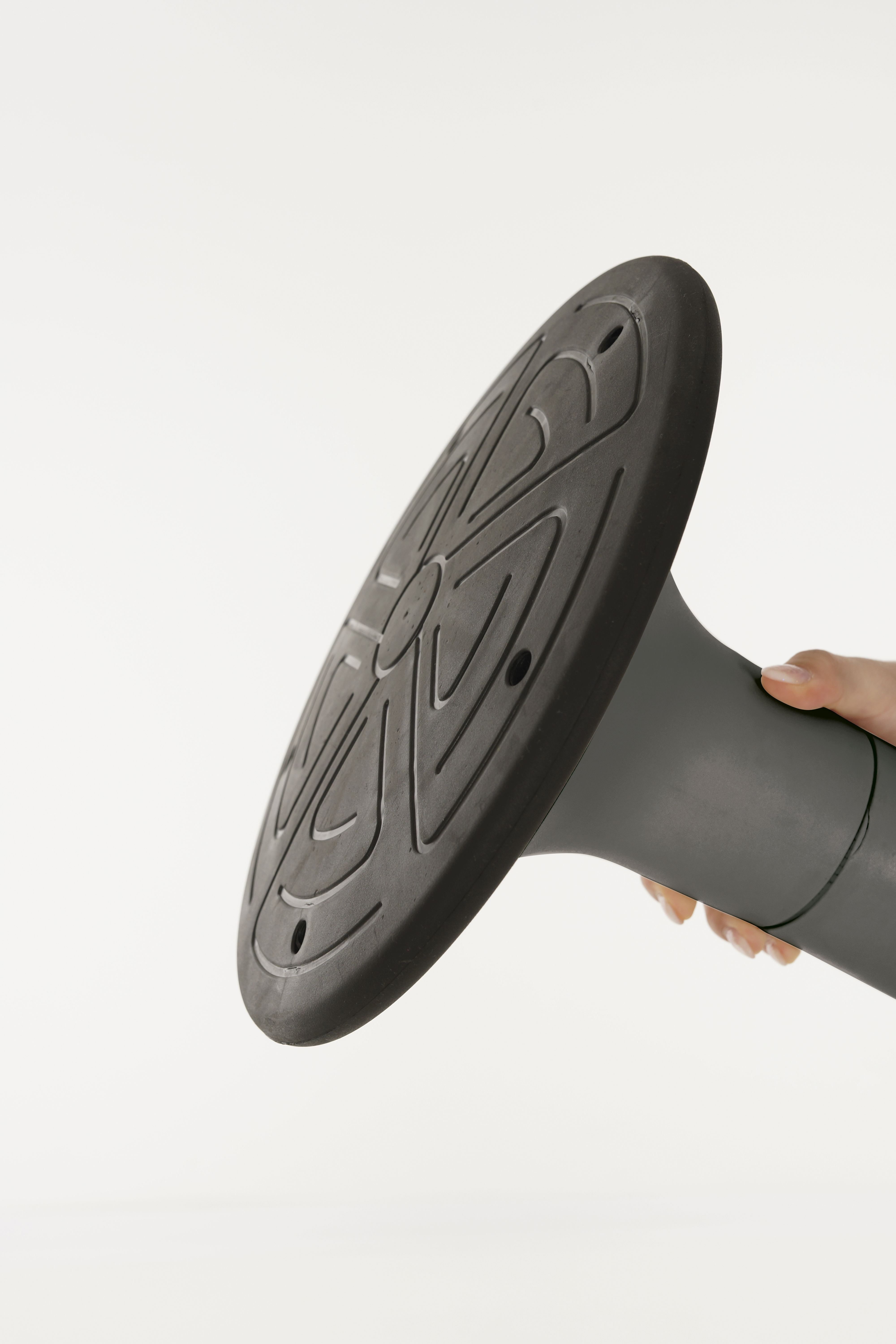 Ergonomisch geformter pilzförmiger Polstersitz mit schwingendem Standfuß in verschiedenen Sitzhöhen (47 cm, 55 cm und 62 cm).