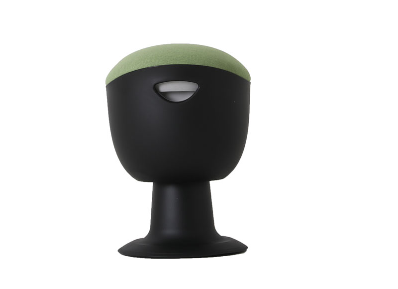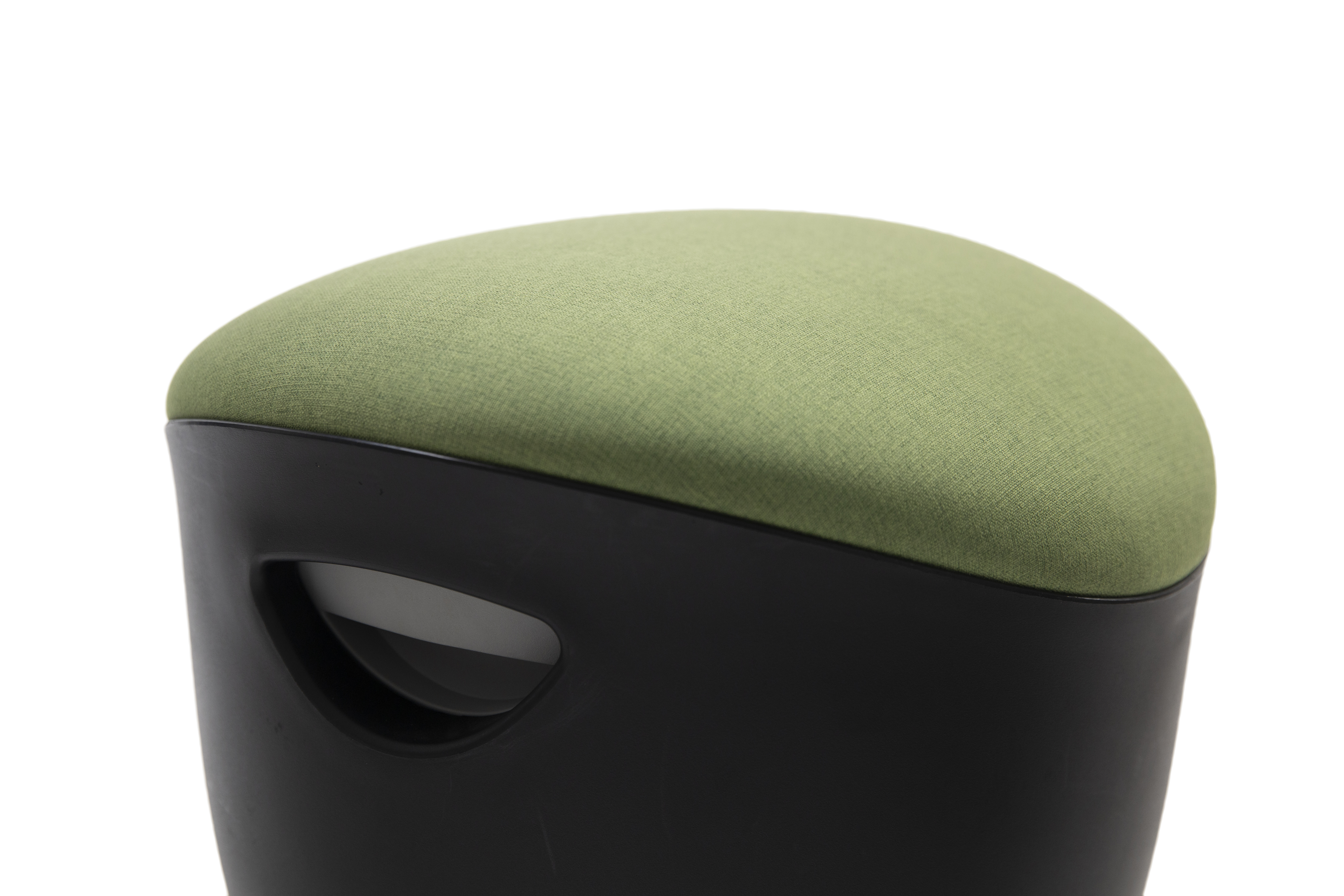 Ergonomisch geformter pilzförmiger Polstersitz mit schwingendem Standfuß in verschiedenen Sitzhöhen (47 cm, 55 cm und 62 cm). Rutschfester Gummifuß, platzsparend und leicht verstaubar.