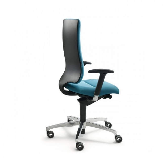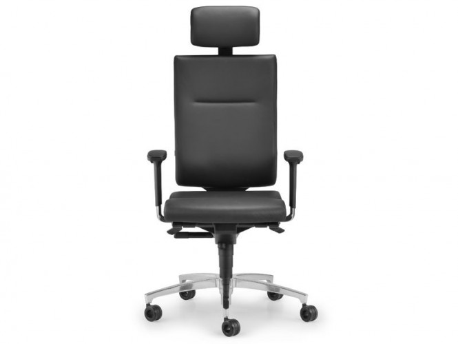 Mit hoher, organisch ausgeformter Rückenlehne, aktiver Beckenkammstütze und dreigeteilter Sitzschale für durchgehend direkten Körperkontakt, Sitztiefenverstellung serienmäßig mittels Schiebesitz.