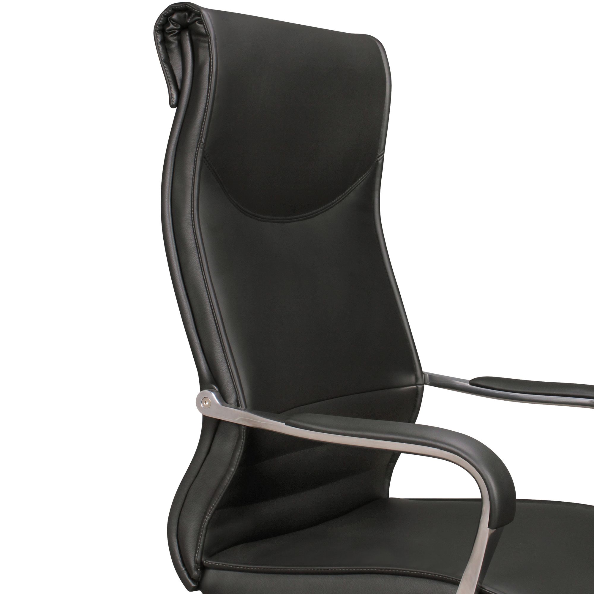 Elegant und bis 120kg belastbar! Der LAUSANNE ist ideal für schwerere Personen geeignet, da die Gasdruckfeder bis 210kg (Dauerbeanspruchung) ausgelegt ist! An Exklusivität und Hochwertigkeit mangelt es dem LAUSANNE nicht. Die hochwertige Polsterung ist mit einem strapazierfähigen Kunstlederbezug ausgestattet, welcher elastisch ist, sprich: bei Belastung dehnt er sich aus und bei Entlastung zieht er sich wieder zusammen. Das sieht nicht nur schöner aus sondern erhöht auch die Lebensdauer des Bezuges. Der Stuhl fußt sicher auf einem sehr stabilen Metallgestell. Die Sitzhöhe ist stufenlos verstellbar, was ergonomisches Sitzen ermöglicht. Der eingebaute Wippmechanismus sorgt zudem für mehr Bewegungsfreiheit. Am Metallgestell sind 5 Leichtlaufrollen angebracht, welche eine hohe Standsicherheit gewähren. Sie sind sowohl für Teppich- als auch für Hartböden geeignet. Materialzusammensetzung Sitzbezug: Kunstleder (100% Polyurethan) Sitz: Bezug: feinstes Kunstleder, Sitz, Arm- und Rückenlehne bequem gepolstert. Moderner Look trifft auf optimalen Komfort. Gestell:Stabiler Chefsessel mit verchromtem Metallgestell, inklusive 5 Leichtlaufrollen. Höhenverstellbar durch GasdruckfederBesonderheiten:Ideal für große und schwere Personen geeignet, belastabr bis 210kg.Wippfunktion für mehr BewegungsfreiheitPflegehinweise:Zur Reinigung empfehlen wir ein mit lauwarmem Wasser angefeuchtetes BaumwolltuchOberflächen nur mit geeignetem Aufsatz absaugenKeine Haushaltsreiniger verwenden