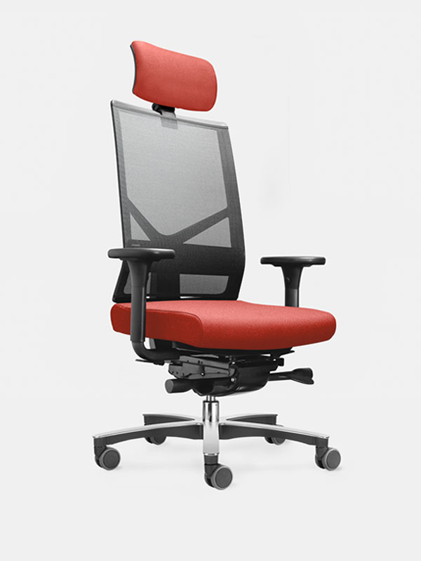 Stilo ES operator mit Polster- oder Netzrückenlehne und Syncro-3D-Balance-Technik. Sitz und Rückenlehne folgen den Bewegungen des Sitzenden synchron im richtigen Winkelverhältnis. Stufenlose, unmittelbar spürbare Einstellung des Rückenlehnengegendrucks (= Tension) für ca. 50–125 kg Körpergewicht. Synchronbewegung stufenlos arretierbar mit zusätzlicher automatischer Neigung des gesamten Stuhloberteils nach vorn (bis -8°) und zu beiden Seiten (+/- 6°). Optional mit fixierbarer 3D-Balance-Technik. Optional: Fußkreuz Aluminium poliert