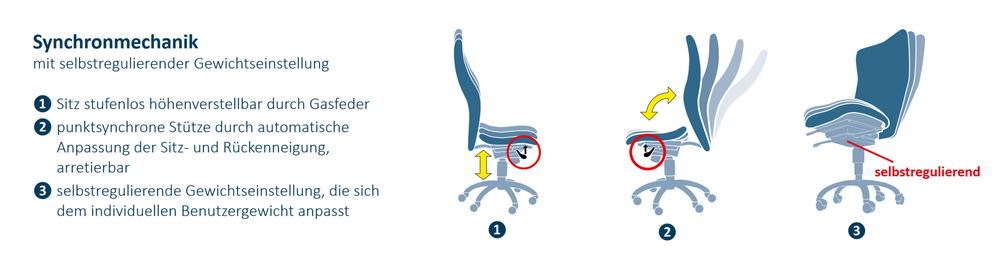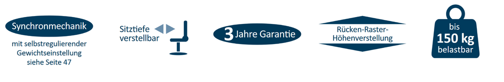 Hoher Rücken und Sitz im Standard unifarben gepolstert. Synchronmechanik mit selbstregulierender Gewichtseinstellung und integrierter Sitztiefenverstellung, Rücken mit Raster-Höhenverstellung, besonders stabiles Aluminium-Fußkreuz und Gasfeder, inkl. große Chrom-Rollen (auch für Hartböden geeignet), optional mit 4D-Armlehnen in Alu-Ausführung, 3 Jahre Garantie, Sitzhöhe 49 - 61 cm.