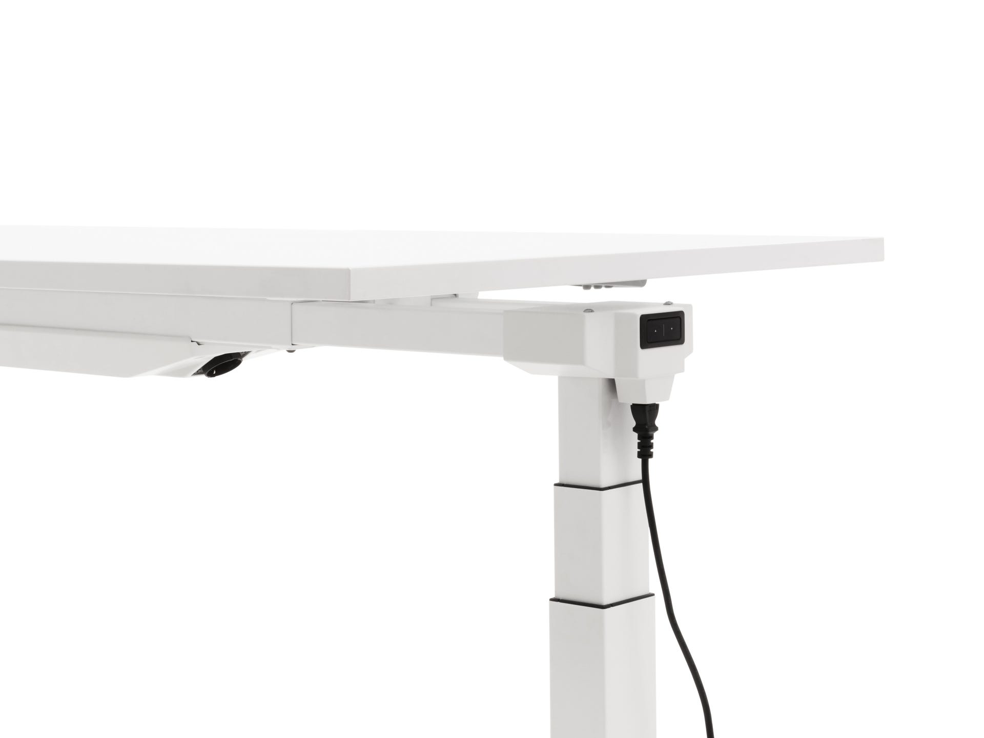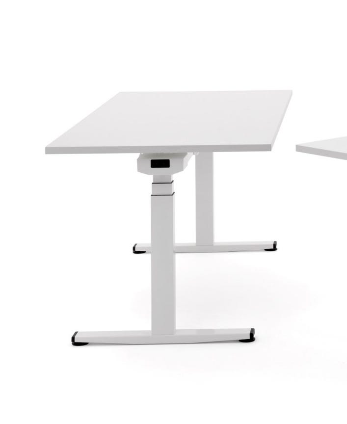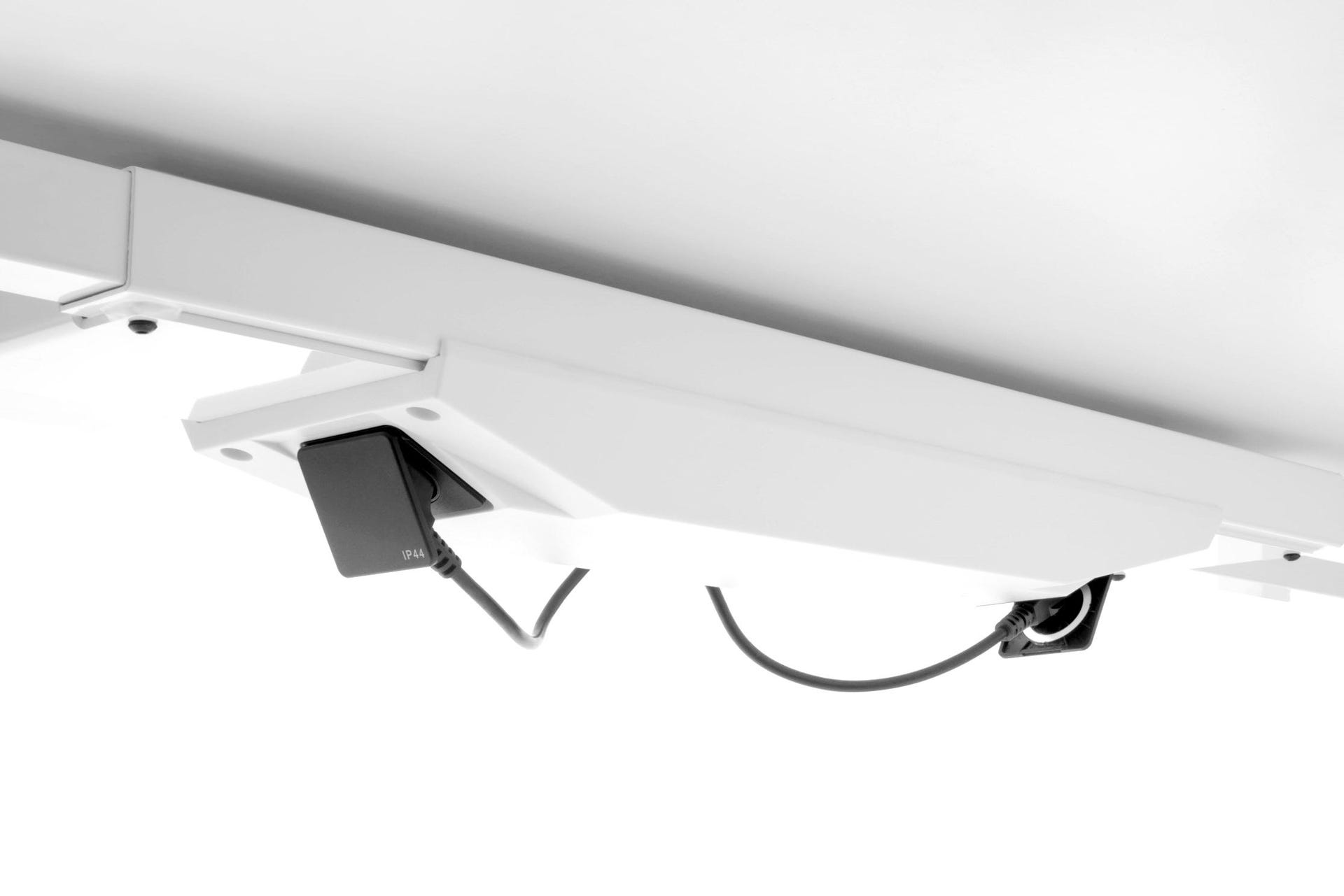 Elektrisch höhenverstellbarer Schreibtisch (74-140 cm) der universell einsetzbar ist. Zur Standardausstattung gehören ebenfalls Stromsteckdosen an der Unterseite.