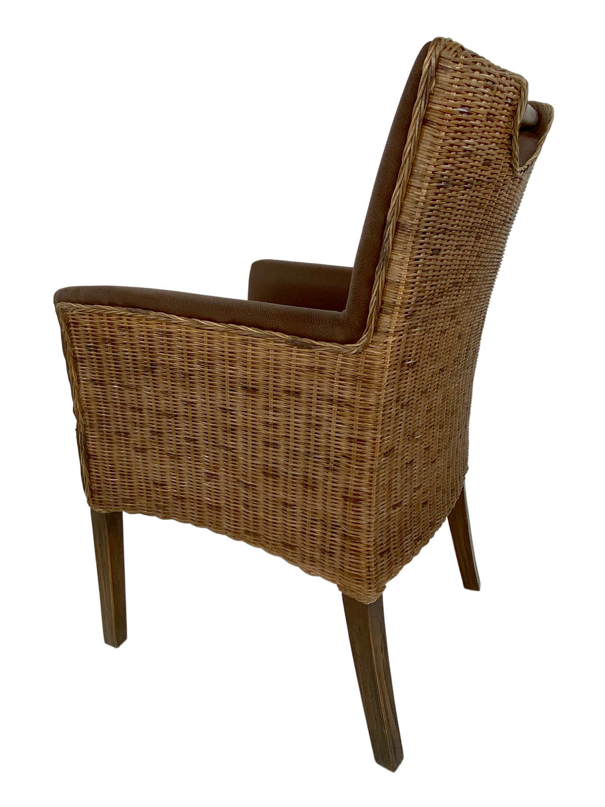 Der Rattansessel Bilbao ist ein von Hand hochwertig verarbeiteter Sessel für Esszimmer oder Wintergarten aus Naturrattan. Sein besonders gutes Preis-Leistungs-Verhältnis und die hochwertige, robuste Bauweise zeichnen diesen Esszimmer Stuhl mit Festpolster auf Sitz und Rücken aus. Er verfügt über Armlehnen und zudem über ein praktisches Griffloch in der Rückenlehne. Die straff geflochtenen Rattanruten erzeugen eine hohe Stabilität und Festigkeit (Tragkraft ca. 200 kg). Alle Rundungen und Übergänge sind sehr sorgfältig geflochten. Durch die hochwertige Verarbeitung und die optimale Sitzhöhe von 48 cm wird dieser Stuhl Sie über viele Jahre hinweg mit angenehmem Sitzkomfort begleiten. Der Polstersessel hat Kunststofffußgleiter, so dass Parkett und Fußböden beim Schieben nicht beschädigt werden. Die Microfaser-Festpolster können mit handelsüblichen Textilreinigern gereinigt werden, sollte einmal ein Fleck auftreten. Achtung! Diese Stühle werden von Hand produziert und sind nie ganz gleich. Jedes Stück ist ein Unikat!