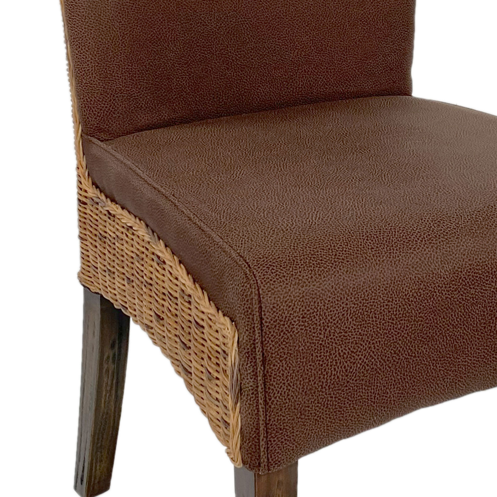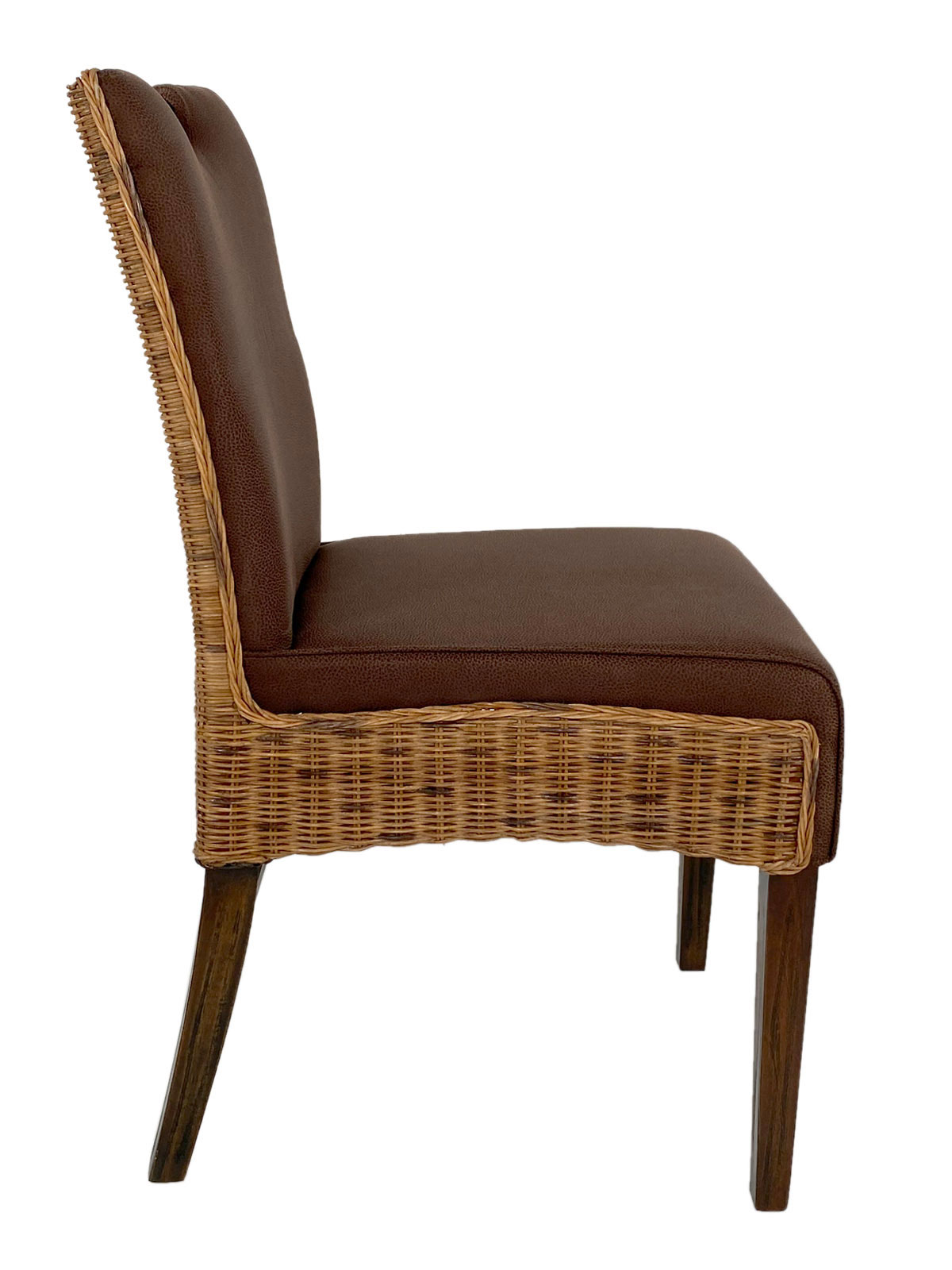 Rattanstuhl modern und trendig von Hand hochwertig verarbeitet mit Festpolster Sitz- und Rückenkissen im Landhausstil Esszimmer Stuhl aus Naturrattan mit extrahoher und eleganter Rückenlehne bis 150 kg belastbar Beine aus massivem Mangoholz Rattanstuhl mit angenehmem Sitzkomfort und optimaler Sitzhöhe sowie unempfindlichem Bezugsstoff Polsterstuhl - Bezugsstoff Mikrofaser in Wildlederoptik - jeder Stuhl ist ein Unikat (keine Maschinenfertigung!) Der Antonio Rattanstuhl ist ein hochwertiger Stuhl, der aus Naturrattan gefertigt und manuell verarbeitet wird. Es ist ein sehr bequemer Stuhl mit einer hochwertigen und robusten Bauweise. Der Stuhl hat eine extra hohe Rückenlehne und feste Sitz- und Rückenpolster. Die straff geflochtenen Rattanruten sorgen für hohe Stabilität, sodass er eine Tragfähigkeit von bis zu 150 kg aufweist. Rundungen und Übergänge sind sehr schön gestaltet und wurden sorgfältig geflochten. Es bietet ein sehr gutes Preis-Leistungs-Verhältnis und ist daher ideal für Esszimmer, Gästezimmer, Jugendzimmer oder Wintergarten. Der Stuhl passt perfekt zu Rattantischen, aber auch zu Massivholztischen in Akazie, Buche, Eiche, Seesham, Teak und Pinie. Achtung! Diese Stühle werden von Hand produziert und sind nie ganz gleich. Jedes Stück ist ein Unikat!
