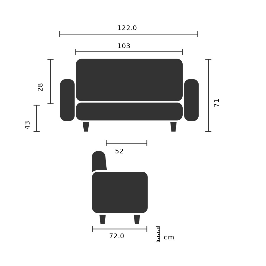 - Abmessungen 2-Sitzer: B 122cm x H 71cm x T 72cm
