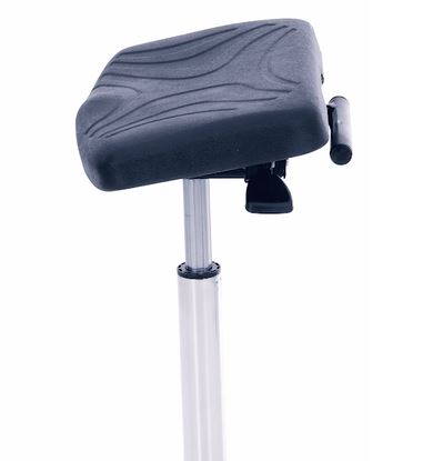 XXL-Sattelstehhilfe Futura bis 200 kg. belastbar, mit Stahlgestell, klappbar und Sitzhöhenverstellung über Handrad (55 - 77 cm.), Rückenlehne pendeln gelagert und höhenverstellbar, ausgestattet mit standfesten Gleitern sowie zusätzlichen kleinen Rollen für den einfachen Transport.