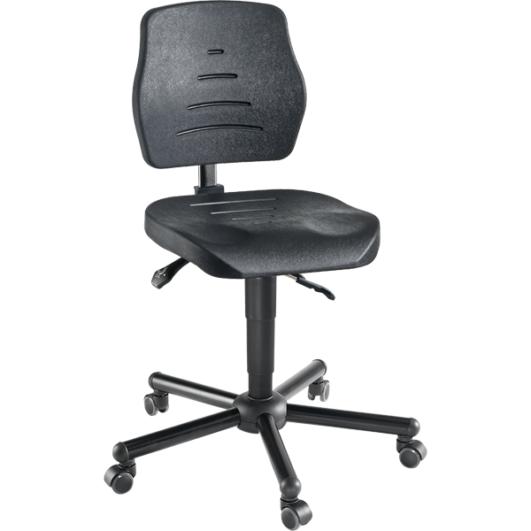 Arbeitsdrehstuhl mit Stahlfußkreuz und Sitz aus PU-Schaum bis 170 kg. belastbar. Der Sitz ist dreh- und höhenverstellbar. Der Rücken ist pendelnd gelagert und ist höhen- und tiefenverstellbar. Ausgestattet mit Gleitern, optional mit lastabhängig gebremsten weichen Rollen wählbar.