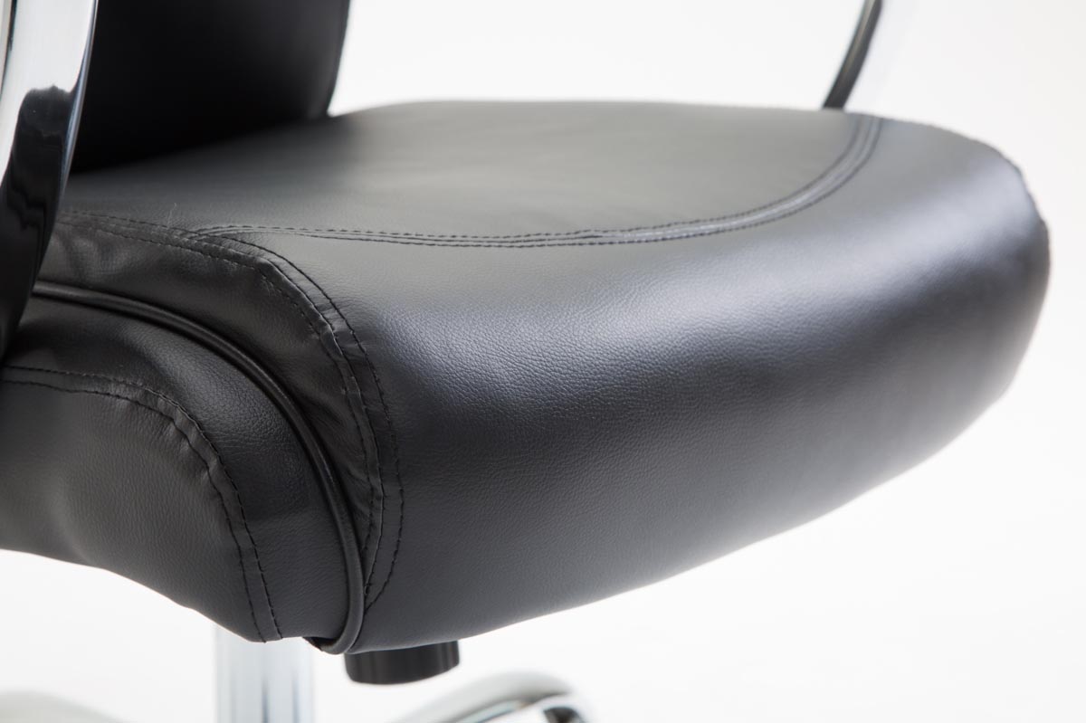 Der XL Bürostuhl Vaud ist ideal für große und schwere Personen geeignet, da die Gasdruckfeder auf einen dauerhaften Gebrauch bis zu 140 kg ausgerichtet ist. Es handelt es sich um einen Bürostuhl mit hochwertiger Polsterung und Kunstlederbezug. Kunstlederbezüge haben den Vorteil, dass sie elastisch sind und sich bei Entlastung wieder glatt ziehen. Dies sieht nicht nur schöner aus, sondern erhöht zusätzlich die Lebensdauer des Sitzbezuges. Die Sitzhöhe ist mit dem Hebel unter dem Sitz stufenlos verstellbar, dadurch ist ergonomisches Sitzen garantiert. Der eingebaute Wippmechanismus sorgt zudem für mehr Bewegungsfreiheit. Das Gestell des Bürostuhls besteht aus Metall in Chromoptik. Standsicher steht er auf fünf robusten Kunststofflaufrollen. Egal ob Hart- oder Teppichböden - Sie werden immer leicht und locker über den Boden rollen können.