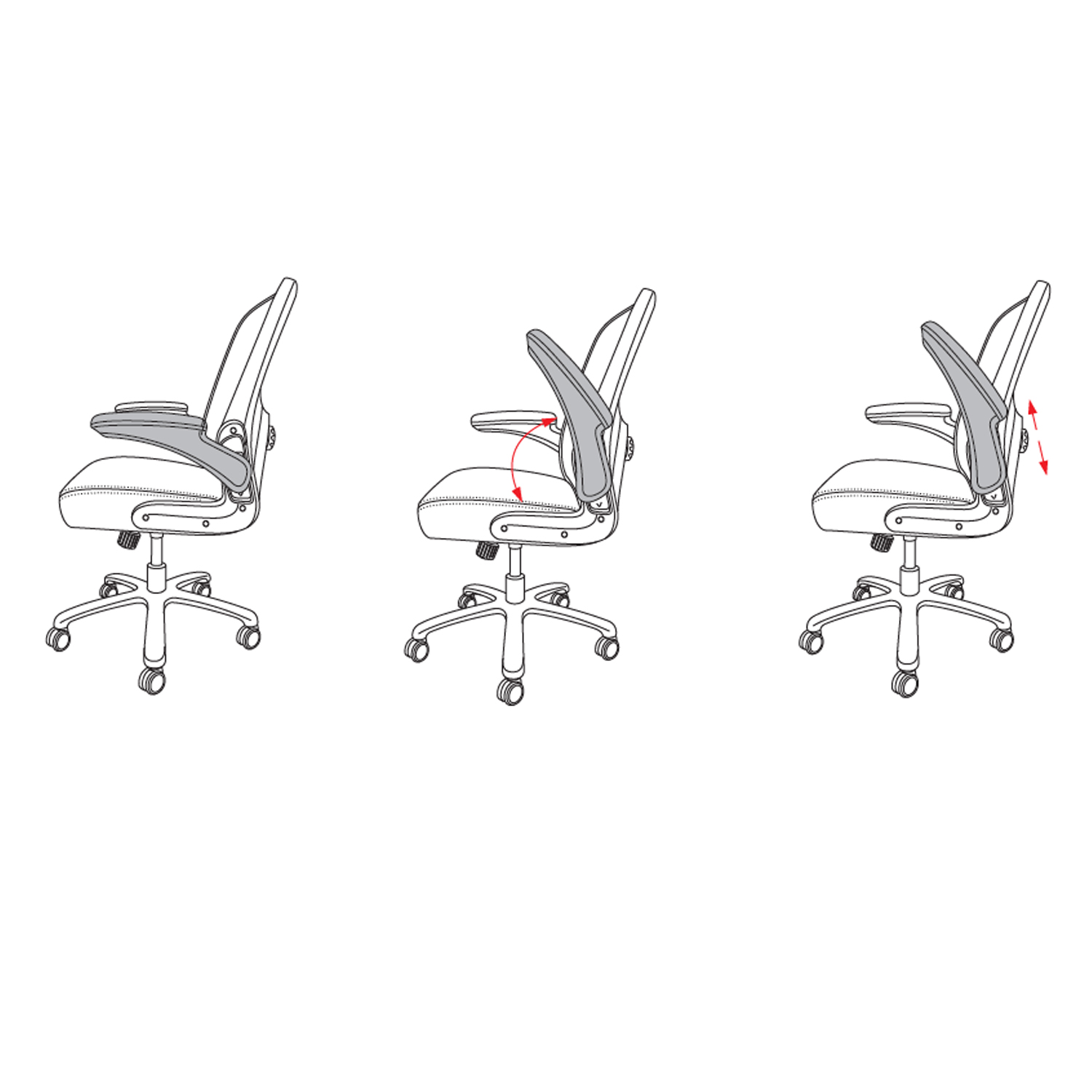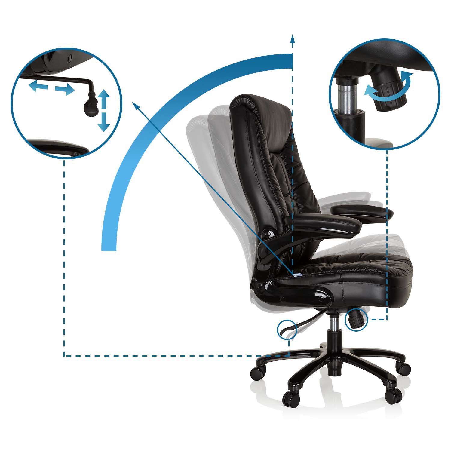 • Die gepolsterten Armlehnen mit Kunstleder-Auflage lassen sich mehrfach in der Höhe verstellen und bei Nichtgebrauch sogar nach oben wegklappen.