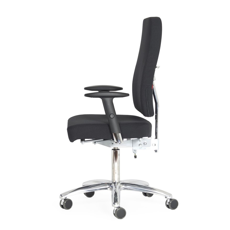 Der Schwerlast-Drehstuhl PANAMERO 885 der fränkischen Firma Löffler bietet zu seinem modernen Design auch noch größten Sitzkomfort - auch über einen langen Bürotag hinweg. Der Bürostuhl lässt sich individuell auf die persönliche Körpergröße und die gewünschte Sitzposition einstellen. Die Rückenlehne ist mehrfach höhenverstellbar und kann zugleich in der bevorzugten Neigung arretiert werden. Löfflers bewährte ERGO-TOP-Technologie besticht mit einem ergonomisch optimalen Sitzgefühl wie auf einem Gymnastikball und kräftigt so die Rückenmuskulatur. Der Sitz und Rückenlehne sind extra breit, der hohen Sitzkomfort macht sogar langes Sitzen angenehm. Der moderne Schreibtischstuhl verfügt über klares und durchdachtes Design mit einer schlichten und seriösen Linienführung. Vom stabilen Fußkreuz über die weich gepolsterte Sitzfläche und die breiten Armlehnen bis zum Rückenteil mit dezent abgesetztem Kopfteil: bei diesem Drehstuhl harmoniert alles auf besondere Weise miteinander. Löffler verwendet bei der Herstellung ausschließlich hochwertiges Material. Rückenlehne 8-fach höhenverstellbar (65-72cm) Sitzöffnungswinkel der Rückenlehne in 5 Positionen arretierbar individuelle seitliche Federkraftverstellung von 65 - 140 kg Sitztiefenverstellung mit Dämpfung ergonomischer Muldensitz mit extra stabilem Taschenfederkern extra breiter Sitz (58cm) und Rücken (56cm) Optional: Multifunktionsarmlehnen, Lordosenstütze, Aufpolsterung Sitz mit 2cm viscoelastischem Schaum Aluminiumfußkreuz und Gasfeder in schwarz oder poliert weiche Doppellaufrollen Ø 65 mm, geeignet für alle Bodenbeläge bis 175 kg TÜV Rheinland zertifiziert GS-geprüft Bezugsstoffe nicht verklebt Mit optionaler Kopfstütze auch für Personen über 190cm Körpergröße einsetzbar. 30 Jahre Hersteller-Garantie, ausgenommen Bezugsmaterialien. Dieser Drehstuhl wird montiert versendet.