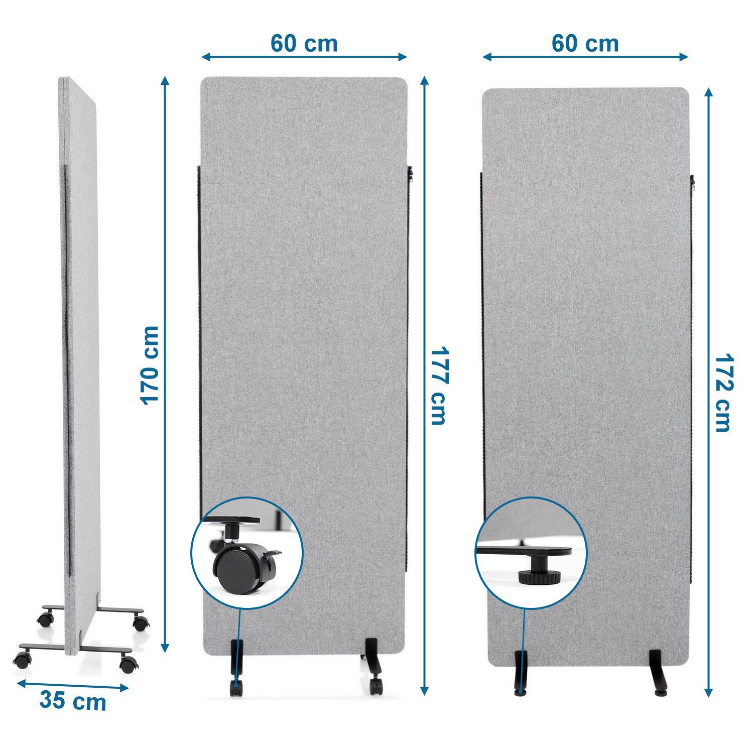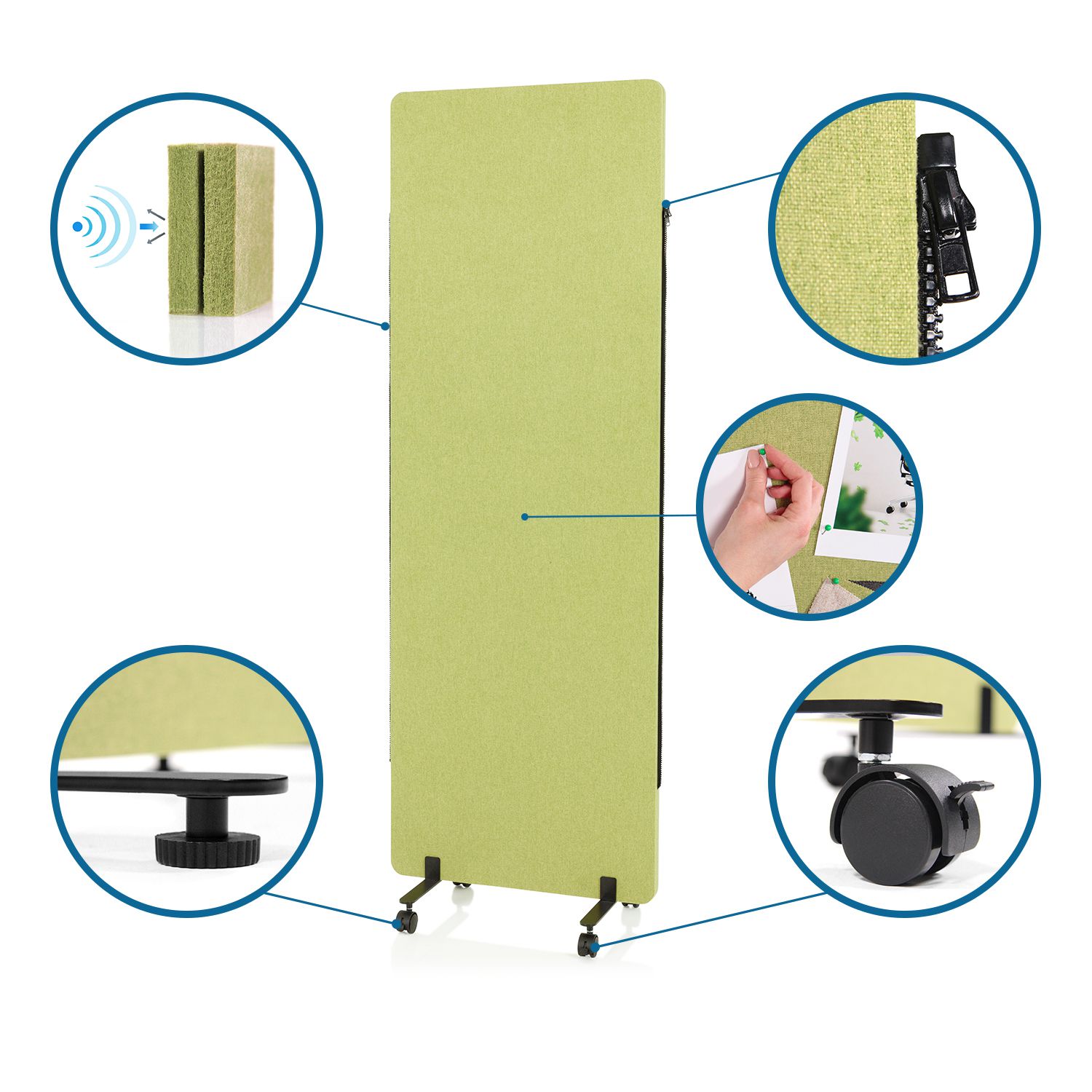 Mittelstück zur Erweiterung des Akustik Raumteiler-Systems FLEXIMIUT. Das mobile Raumteiler-System FLEXMIUT ist in Zeiten von offenen Bürostrukturen, kommunikativem Ideenaustausch und Desk-Sharing unverzichtbar. Geräuschreduktion, Raumstrukturierung, Sichtschutz und Infowand - dieses moderne Trennwandsystem erfüllt all diese Funktionen zur selben Zeit und überzeugt zudem durch schlichtes und modernes Design. Die Leichtbaukonstruktion ermöglicht eine einfache Umplatzierung und so auch den flexiblen Einsatz zum Lärmschutz oder zur Raumtrennung. Höchste Konzentration und harmonische Zusammenarbeit garantiert! Ein weicher Stoffbezug in harmonischen Farben macht die Trennwand zum modernen Designelement Gesamthöhe von 1,77 m (mit Rollen) oder 1,72 m (mit Bodengleitern) Ideal als Sichtschutz oder als Unterteilungselement bei der Arbeitsplatzgestaltung Oberfläche geeignet als Pinnwand, auch Klebezettel halten auf der Oberfläche aus hochwertigem Stoff problemlos Schnelle und einfache Verkettung mehrerer Elemente durch praktischen Reißverschluss an den Innenseiten Innenmaterial aus recyceltem PET-Material, doppellagig, schadstoffgeprüft nach OEKO-TEX Standard 100 – Institut Hohenstein HTTI, Zertifikat Nr.: 13.HCN.19746 Hohe Standsicherheit durch stabilem Fuß aus verstärktem Aluminium Lieferung sowohl inklusive Multifunktionsrollen mit Feststellbremse als auch Bodengleitern Abmessungen: mit Bodengleitern (H x B x T) 172 x 60 x 35 cm mit Rollen (H x B x T) 177 x 60 x 35 cm