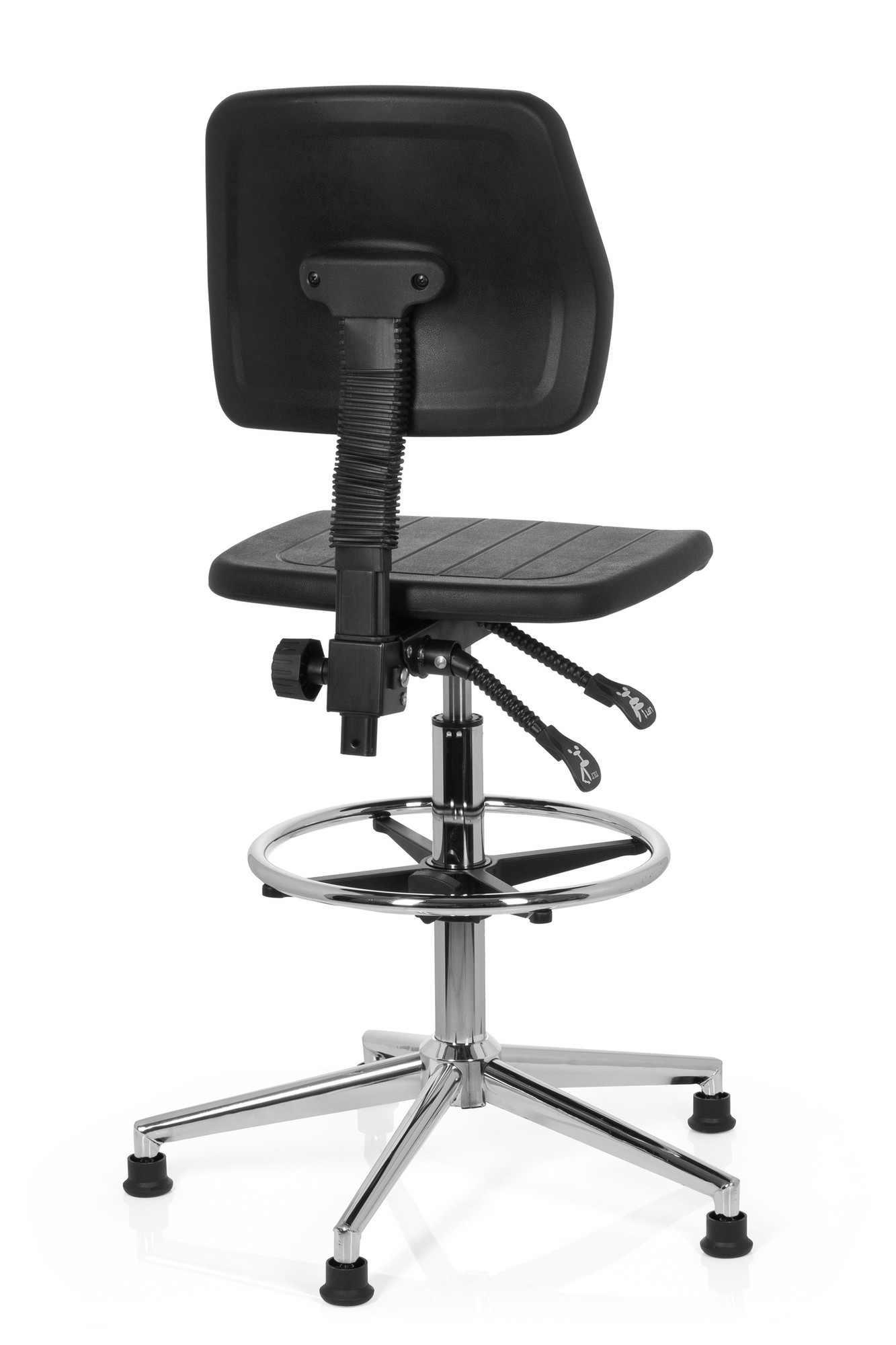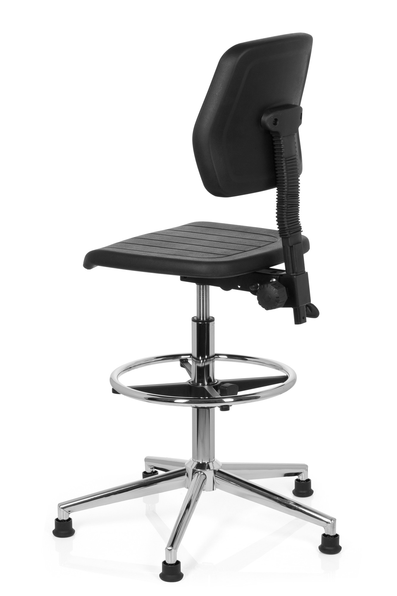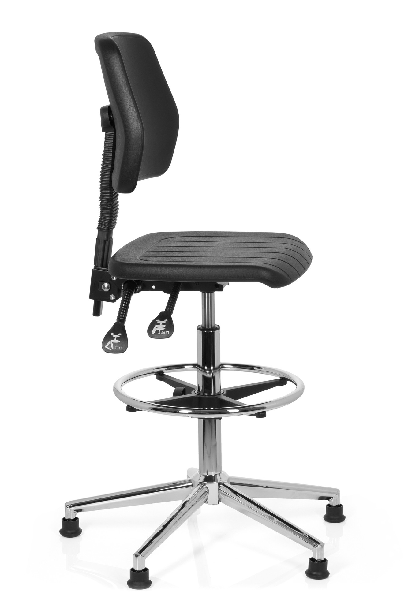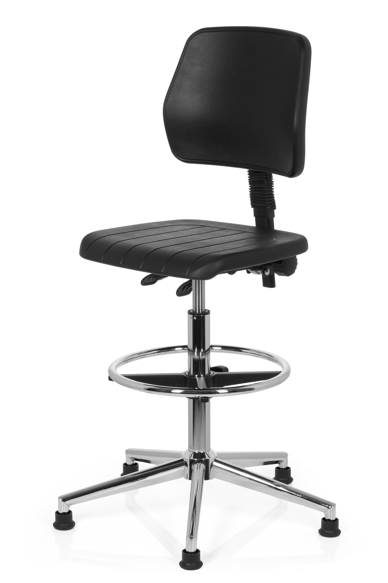 PU-Arbeitsstuhl mit Fußring und pendelnder Rückenstütze, dessen Höhe und Neigung verstellbar ist