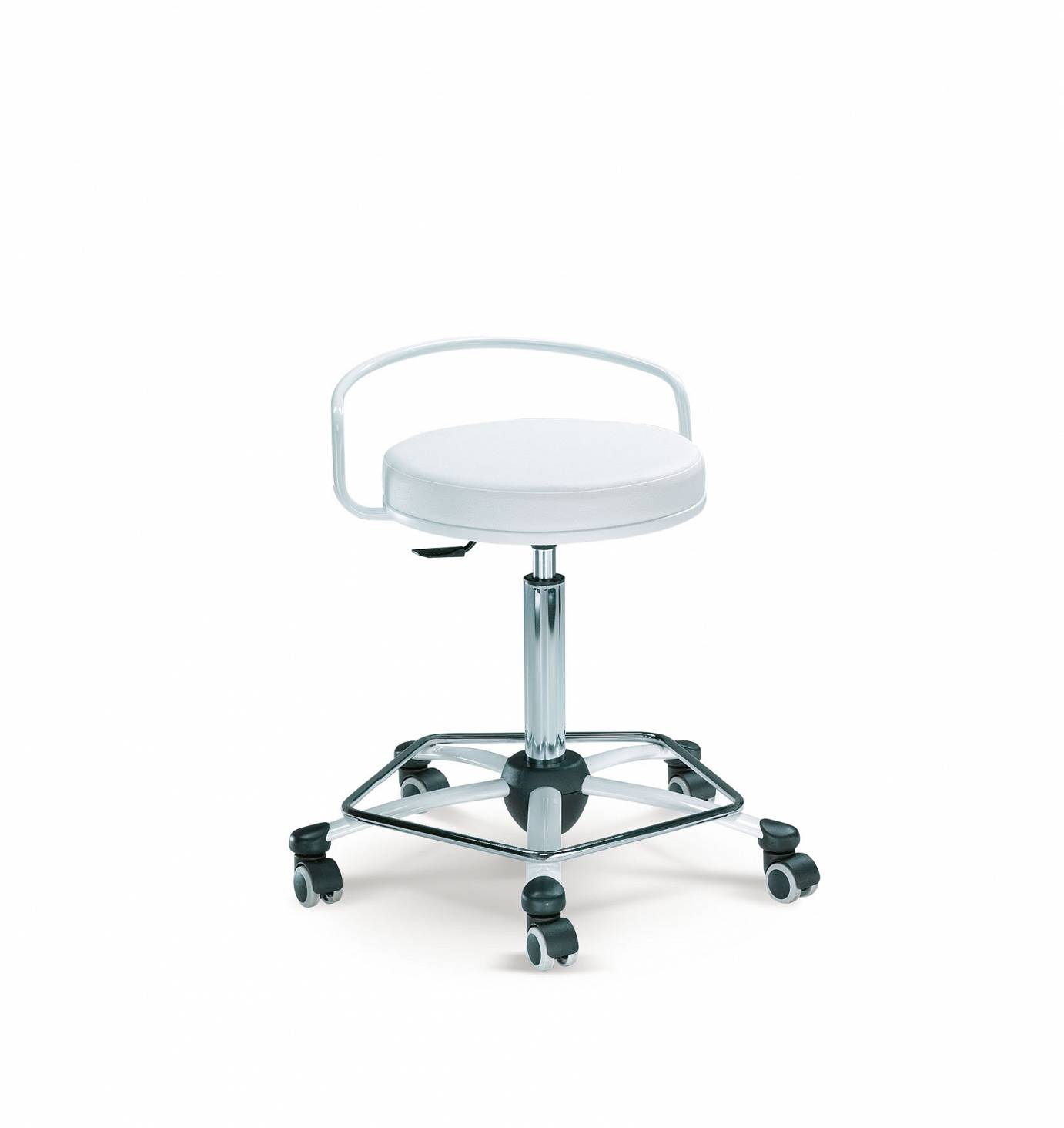 Sitz und Rücken gepolstert ergonomischer Sattelsitz bewegliche Rückenstütze, Rückenstab verchromt, Rückengriff Kunststoff schwarz stufenlose Rücken- und Sitzneigung stufenlose Höhenverstellung (45-56 cm.) großes Alu-Fußkreuz mit einem Durchmesser von 61 cm. Hartbodenrollen inkl. Chromblende